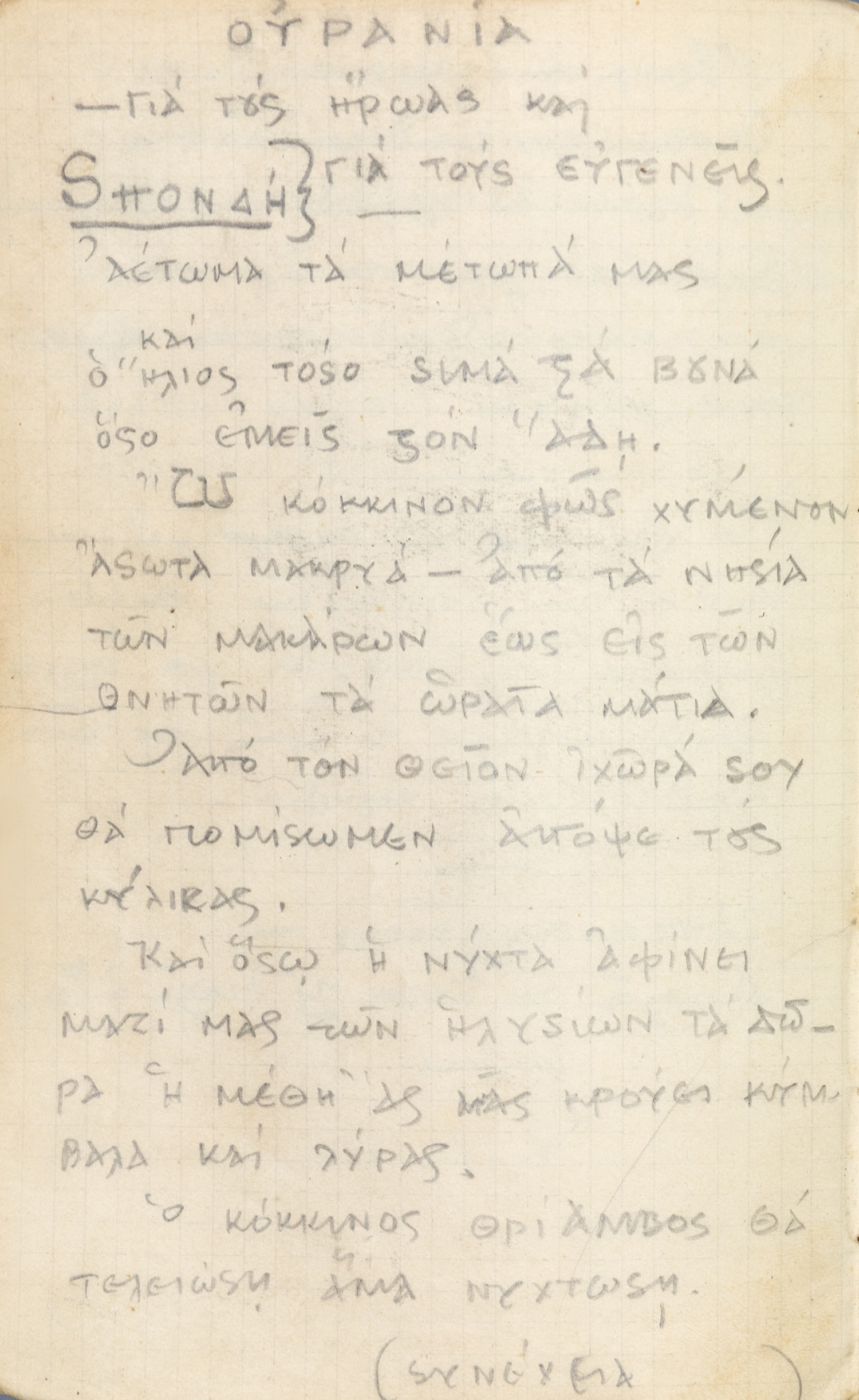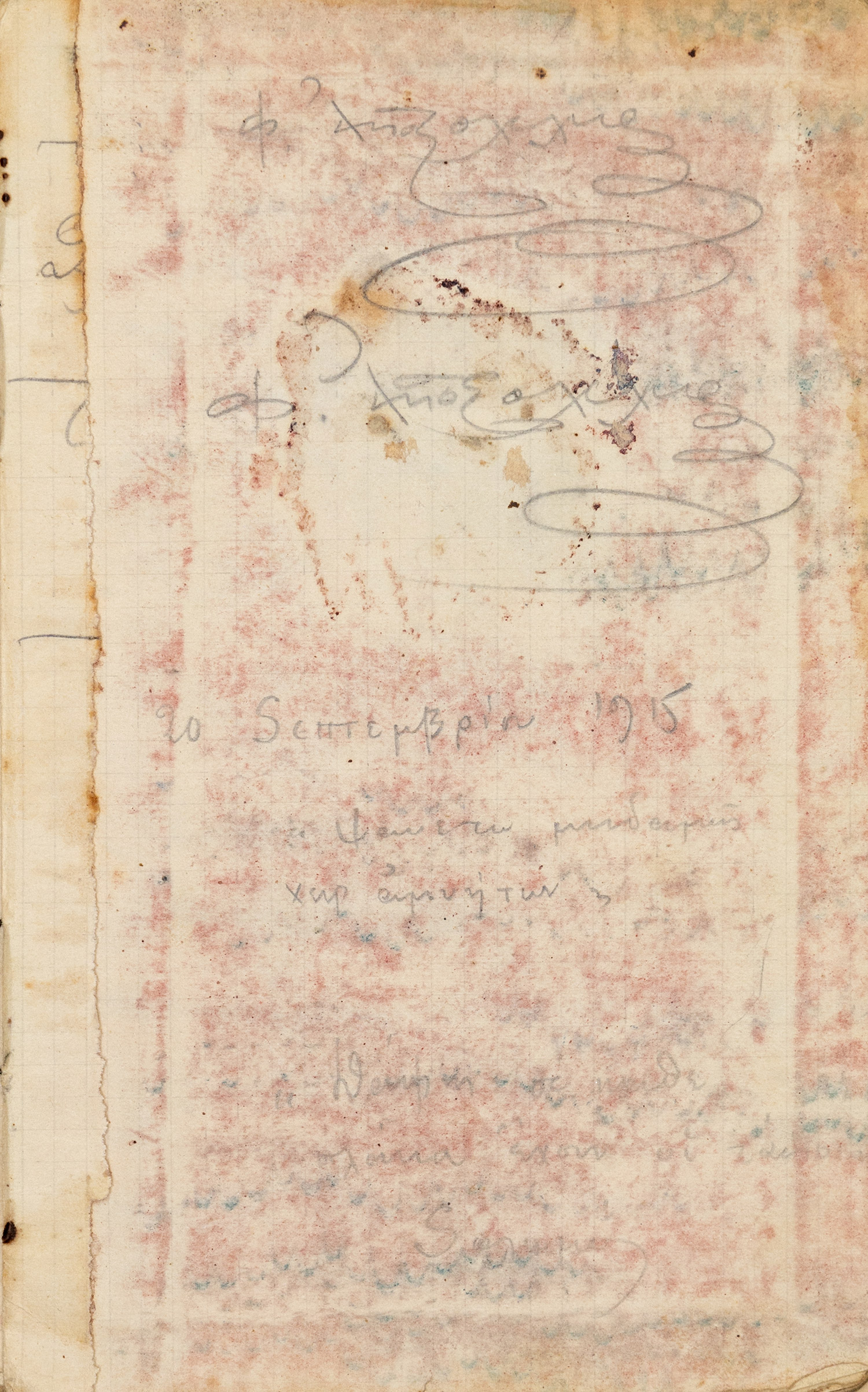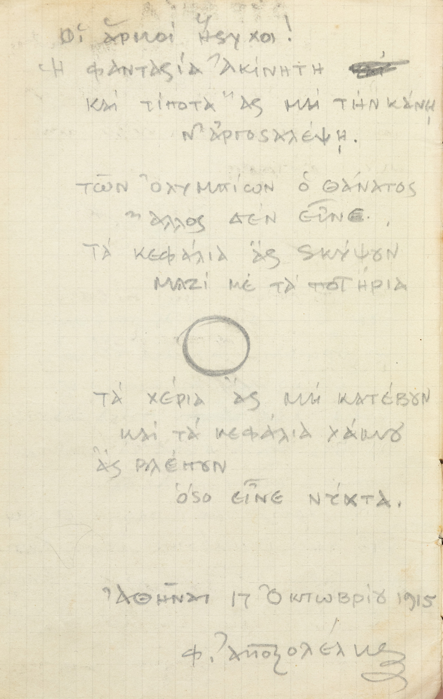 Τιμή εκτίμησης: € 6.000 - 8.000Τεύχος 31 φύλλων με μικρά τετράγωνα (καρέ), 169 x 107 mm., [62] σ. (οι σ. [12], [14] και [52] λευκές, λερωμένο το πρώτο φύλλο, οξειδωμένα δύο άλλα, λυμένα ορισμένα φύλλα). Αυτόγραφες σημειώσεις κυρίως με μολύβι, σε μεμονωμένες περιπτώσεις με μελάνι και χρωματιστό κραγιόνι (σ. [30], [32], [40] και [52]). Τέσσερα ολοσέλιδα σχέδια με μολύβι: (α) Πορτραίτο στρατιώτη, με λεζάντα: «Μιά στιγμιαία / ἀνάμνησις» (σ. [11]), (β) Πορτραίτο στρατιώτη, με λεζάντα: «Ἕνας Ἕλληνας στρατιώτης / πειό μαῦρος ἀπό αἰθίοπα» (σ. [13]), (γ) Χέρι που κρατά ασπίδα (σ. [17]) και (δ) Φιγούρα στρατιώτη, με τη σημείωση: «Ὀκτώβριος / 1915 / Γαλάτσι» (σ. [60]). Υπογραφή και πρώτη ένδειξη χρόνου στη σ. [1]: «Φ. Ἀποστολέλης [δις] / 20 Σεπτεμβρίου 1915», ακολουθεί στίχος από ύμνο στη Θεοτόκο («Ψαυέτω μηδαμῶς / χεῖρ ἀμυήτων») και στίχος του Σολωμού («Δάφνες [σέ] κάθε / πλάκα ἔχουν οἱ τάφοι / Σολωμός»). Τελευταία ένδειξη χρόνου στη σ. [61]: «Ἐπιτρέπομεν εἰς τόν ὑφ’ ἡμᾶς / δεκανέα / Ἀποστολέλη Φώτιον / ὅπως διανυκτερεύσῃ οἴκοι τήν νύκτα / τῆς σήμερον. / Ἀθήναι 9 Νοεμβρίου 1915». Αρχικό πανί που διπλώνει ώστε να σχηματίζει φάκελο (φθορές, αυτόγραφη σημείωση στην πάνω πλευρά: «VITA / SOMNIUM / BREVE [Ένα σύντομο όνειρο είναι η ζωή] / Φ.Α.). • ΕΞΑΙΡΕΤΙΚΑ ΕΝΔΙΑΦΕΡΟΝ ΝΕΑΝΙΚΟ ΑΥΤΟΓΡΑΦΟ ΤΟΥ ΦΩΤΗ ΚΟΝΤΟΓΛΟΥ. Πρόκειται για σημειωματάριο από την περίοδο της θητείας του στον ελληνικό στρατό, το φθινόπωρο του 1915, κατά τη γενική επιστράτευση του Σεπτεμβρίου του ίδιου έτους. Σχετικές σημειώσεις βρίσκουμε στη σ. [21]: «[…] δεκανέας / 2ο Εὐζώνων Σύνταγμα / 9ος λόχος / Μεσολόγγι» και στην τελευταία σελίδα: «6ος Λόχος». • Στο σημειωματάριο περιλαμβάνονται μεταξύ άλλων διάφορες σημειώσεις και μικρά δικά του κείμενα, δύο από αυτά, το πρώτο με τίτλο «Οὐρανία σπονδή για τούς ἥρωας καί τούς εὐγενεῖς» και το δεύτερο με τίτλο «Οὐρανία», υπογεγραμμένα και χρονολογημένα: «Ἀθῆναι 17 [και αντίστοιχα] 15 Ὀκτωβρίου 1915 / Φ. Ἀποστολέλης», στίχοι παραδοσιακών τραγουδιών («Απόψε δεν κοιμήθηκα», και παραλλαγή του «Ο κλέφτης του Ολύμπου»), η Θ´ ωδή του Ακάθιστου Ύμνου και εδάφιο από το Δευτερονόμιον, ποίημα του Γρυπάρη, αποσπάσματα από τον «Θησαυρό των ταπεινών» του Maeterlinck και από έργο του Edgar Allan Poe, ενώ αναφέρονται ο Nietzsche («Ὁ λέων τοῦ πνεύματος») και ο Tolstoy. • Το 1915 ο Κόντογλου είναι μόλις 20 ετών και υπογράφει με το επίθετο του πατέρα του «Ἀποστολέλης».