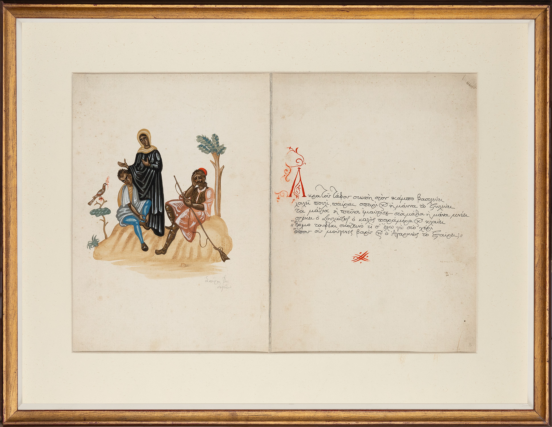 Τιμή εκτίμησης: € 1.200 - 1.600330 x 235 mm., [4] σ. Δίφυλλο με χειρόγραφο το κείμενο του Σολωμού στη δεξιά πλευρά (σ. [3]) και εικονογράφησή του από τον Σπύρο ΒΑΣΙΛΕΙΟΥ στην αριστερή (σ. [2]), τέμπερα, υπογεγραμμένη με μολύβι κάτω δεξιά («Σπῦρος Βα / σιλείου»). Σε κορνίζα.