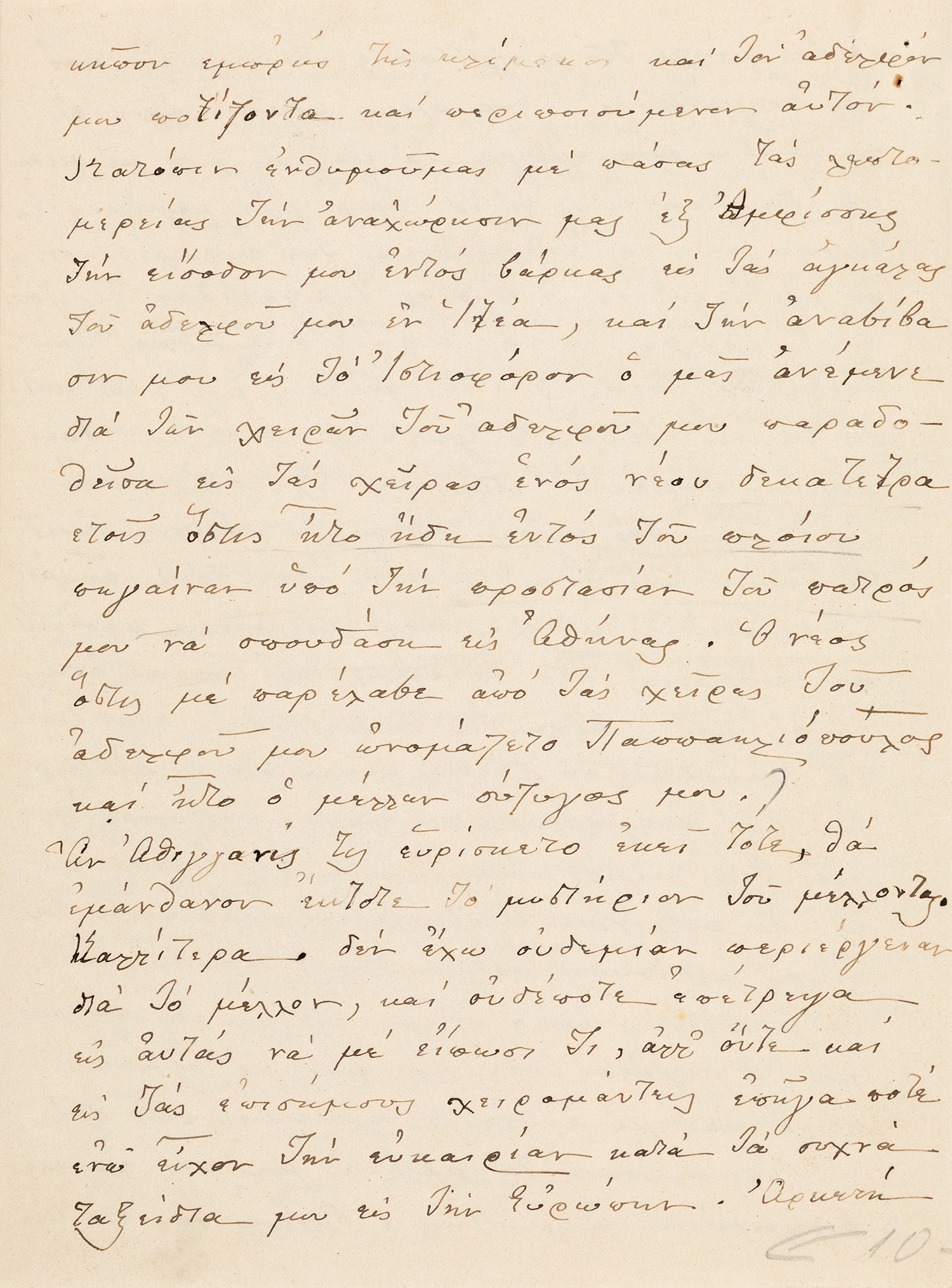 Τιμή εκτίμησης: € 300 - 400Γραμμένη σε 4 λυτά δίφυλλα και ένα φύλλο, αριθμημένα 1-5, 206 x 156 mm. [17] σ. (η τελευταία σελίδα λευκή). • Κόρη του αγωνιστή Θανάση Λιδωρίκη, η Πηνελόπη διετέλεσε επί δεκαετία κυρία των τιμών της βασίλισσας Αμαλίας. Έγραψε διάφορα άρθρα στην Ἐφημερίδα τῶν Κυριῶν και σε άλλα έντυπα. Αποσπάσματα της ανολοκλήρωτης Αὐτοβιογραφίας της δημοσίευσε ο Τ. Λάππας: Πηνελόπη Λιδωρίκη Παπαηλιοπούλου, Αθήνα 1972. Δικό της έργο είναι κατά τον Λάππα και το Σελίδες τινές τῆς ἱστορίας τοῦ βασιλέως Ὄθωνος, Αθήνα 1898 (εκδόθηκε ανωνύμως και έχει αποδοθεί στον αδελφό της Νικόλαο).