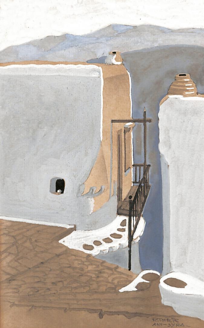 Τέμπερες σέ χαρτί, 195 x 120 καί 105 x 175 mm. Ὑπογεγραμμένες κάτω δεξιά: «R. TOURTE/ KINARO / W DE LEVITHA» καί «R. TOURTE / ANO - SYRA». Σέ κορνίζες. (2)
