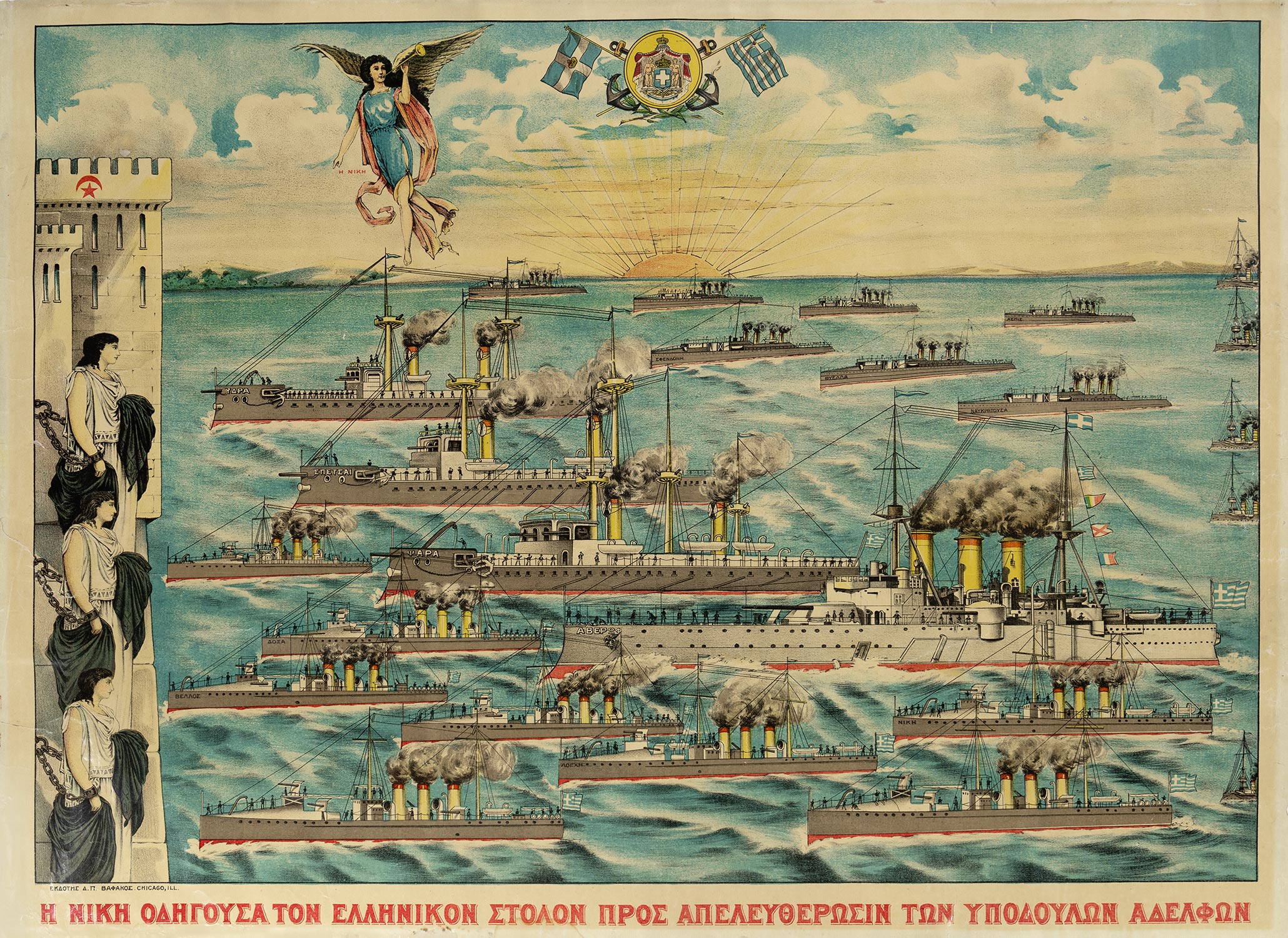 Ἡ Νίκη ὁδηγοῦσα τόν ἑλληνικὸν στόλον πρός ἀπελευθέρωσιν τῶν ὑποδούλων ἀδελφῶν.