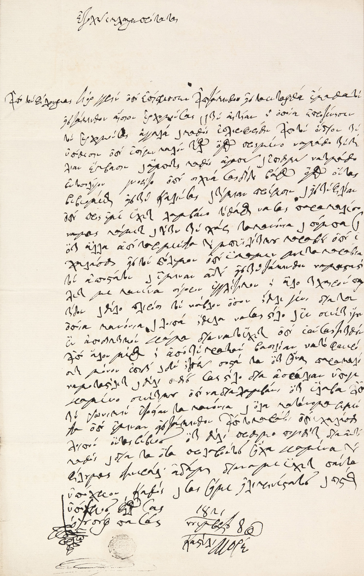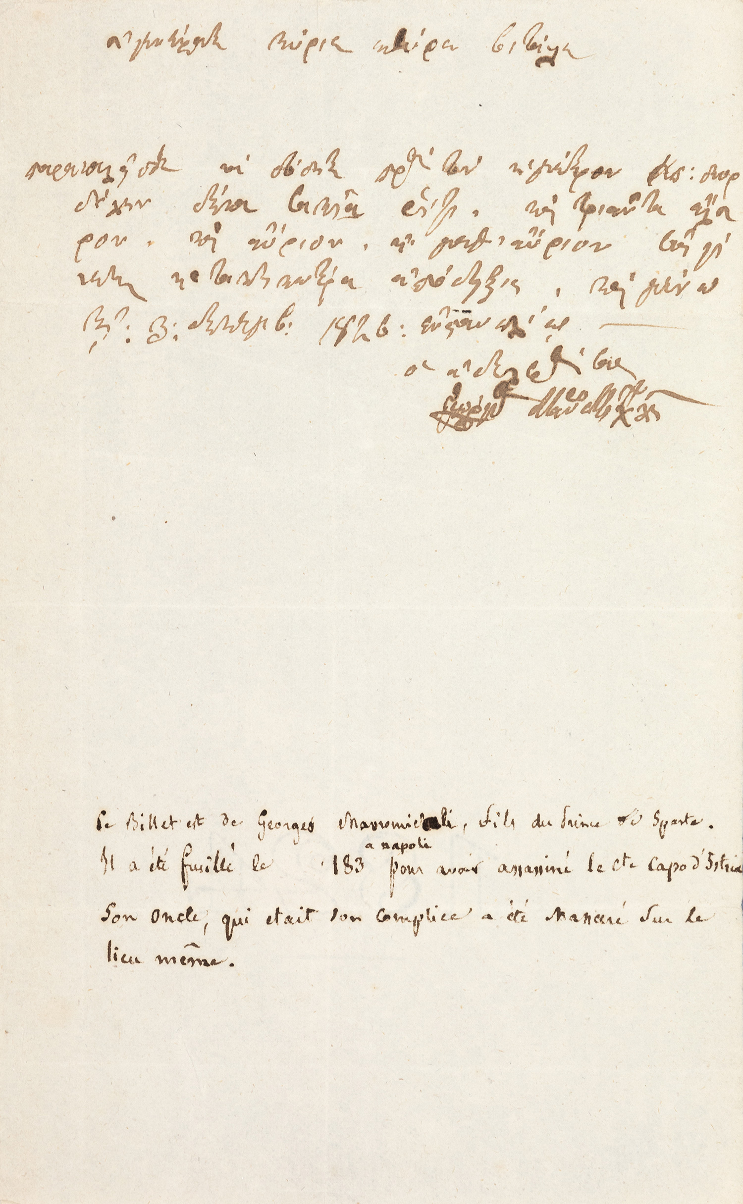 Ἐπιστολή μέ τήν ὑπογραφὴ του («Α. Μαυροκορδάτος») πρός τόν ἀγωνιστὴ Γεωργάκη Βαλ...
