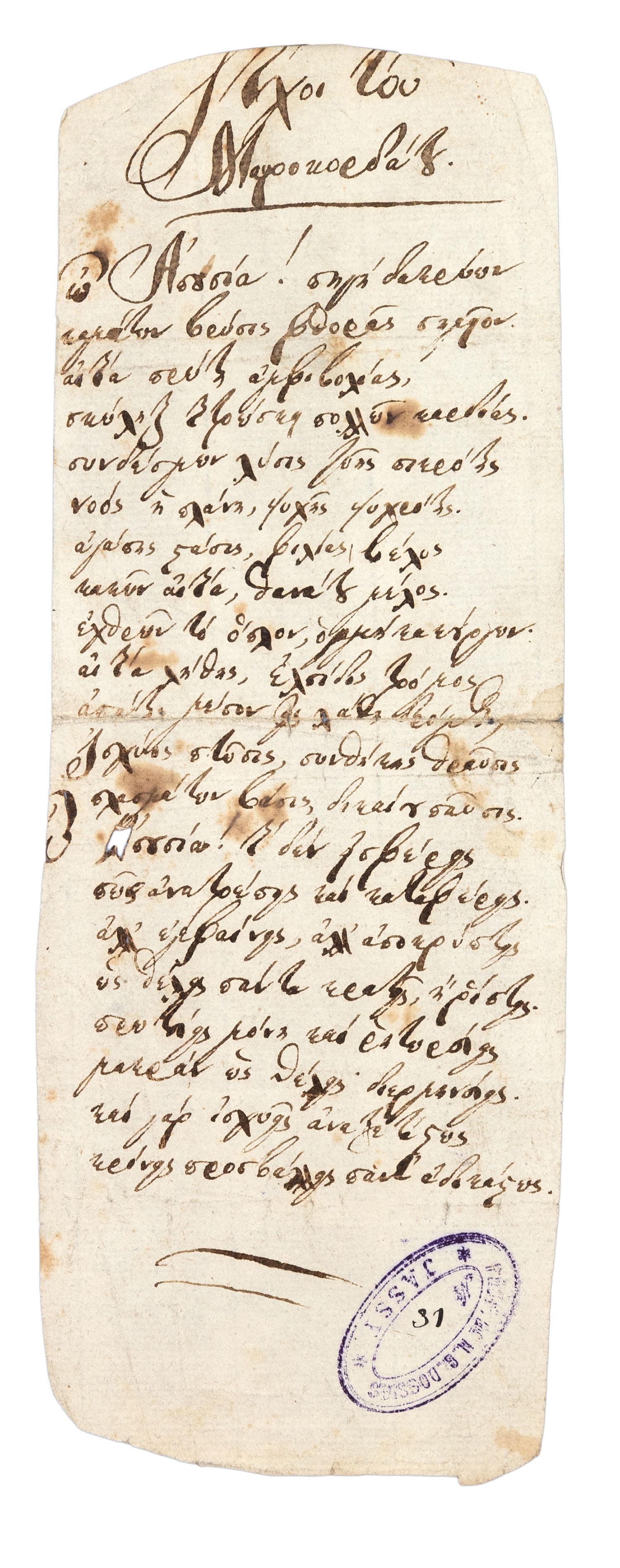 Ἐπιστολὴ τοῦ Ἰουσοὺφ Πασᾶ Τούρκου διοικητῆ τῆς Πάτρας ἀπὸ τὸ Ρίο, ἴσως πρὸς τὸν...