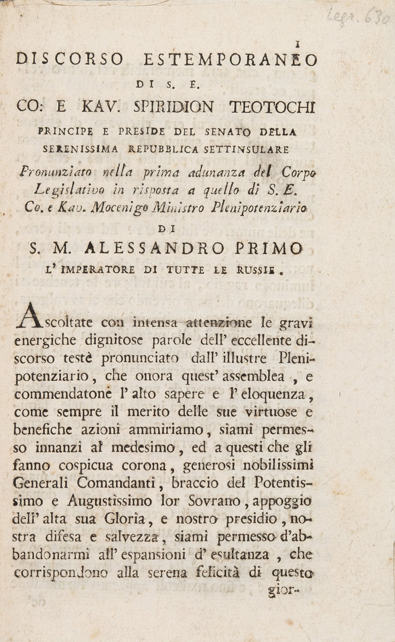DISCORSO ESTEMPORANEO DI S. E. CO: E KAV. SPIRIDION TEOTOCHI, PRINCIPE E PRESIDE...