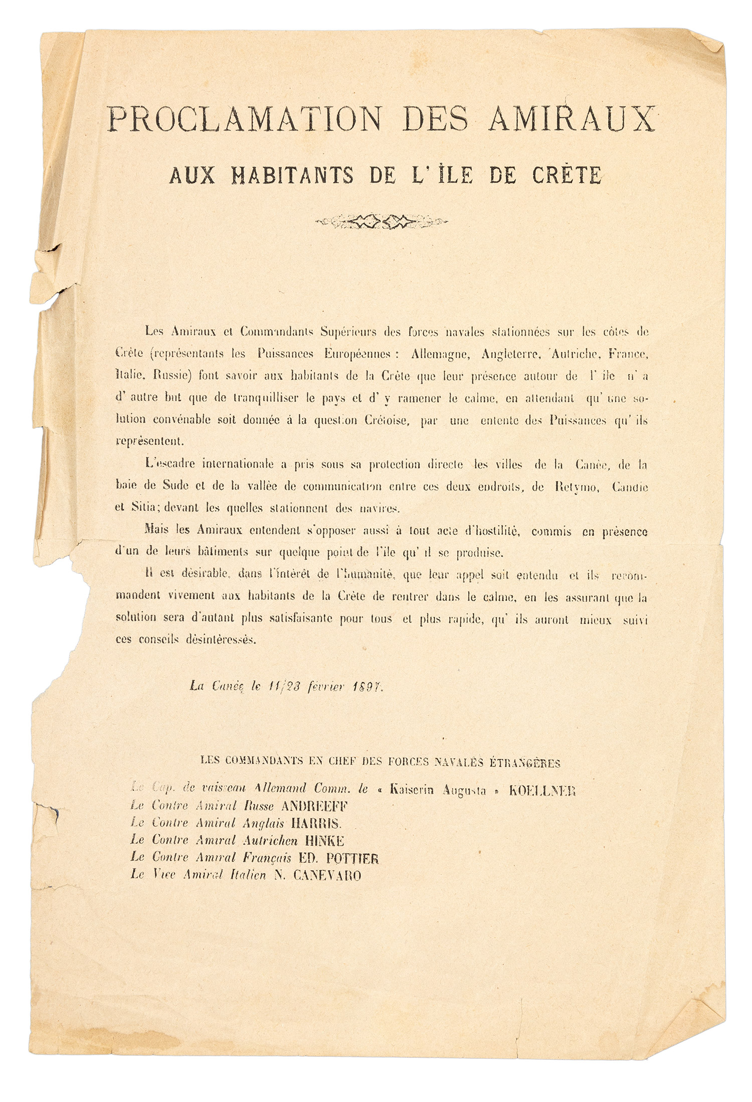 PROCLAMATION DES AMIRAUX AUX HABITANTS DE L’ÎLE DE CRÈTE. Les Amiraux et Comman...