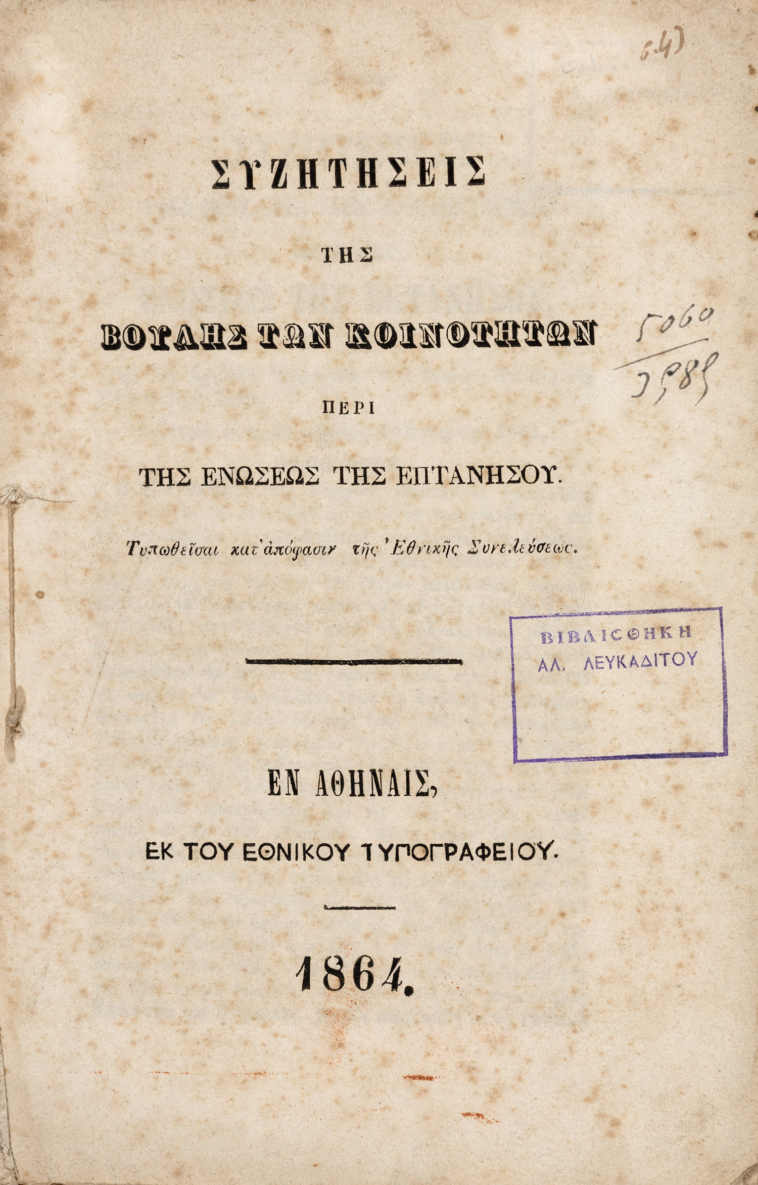 Συζητήσεις τῆς Βουλῆς τῶν Κοινοτήτων περί τῆς ἑνώσεως τῆς Ἑπτανήσου. Τυπωθεῖσαι...