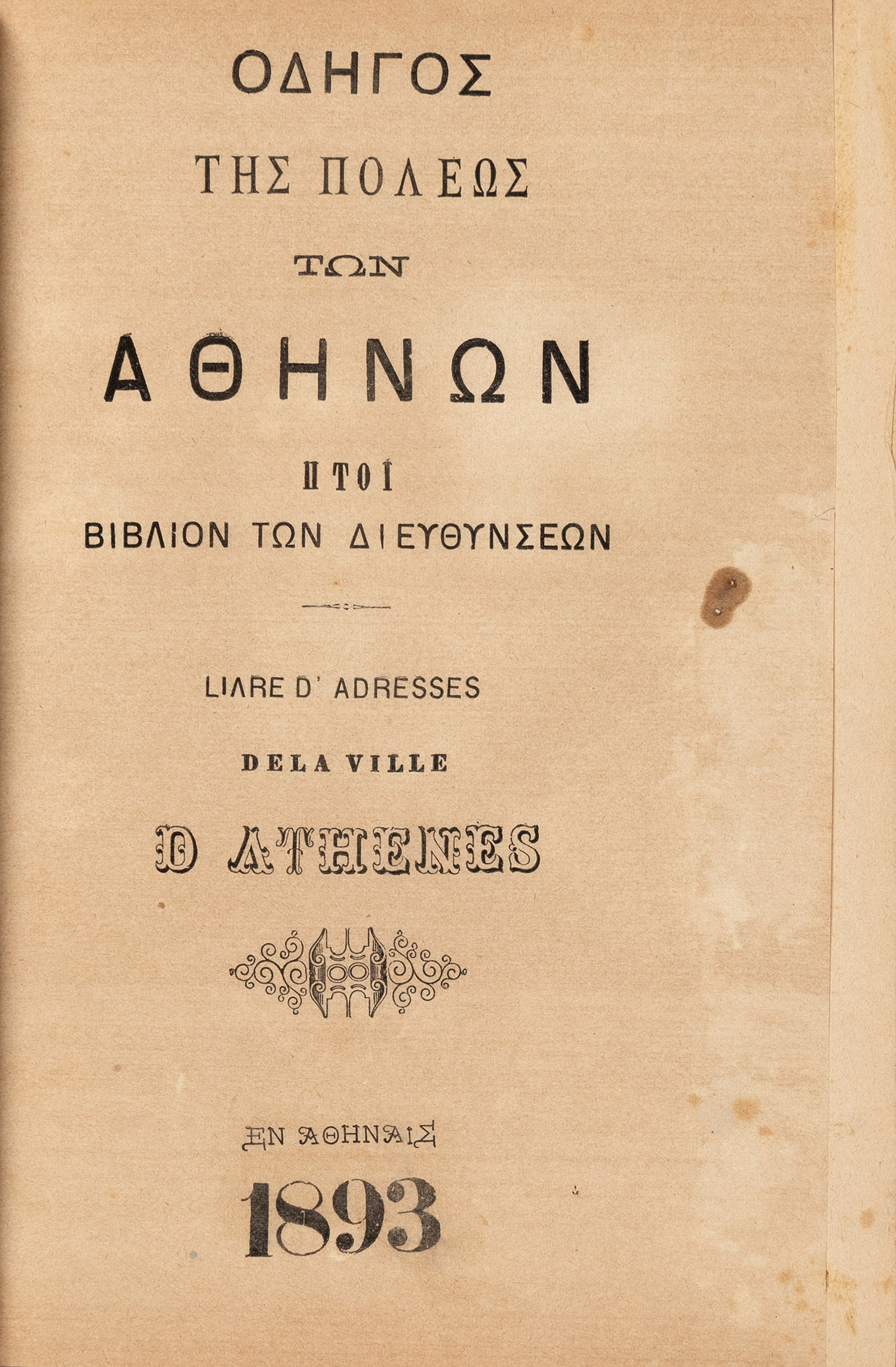 Ὁδηγός τῆς πόλεως τῶν Ἀθηνῶν, ἤτοι βιβλίον τῶν διευθύνσεων. Livre d’adresses de...
