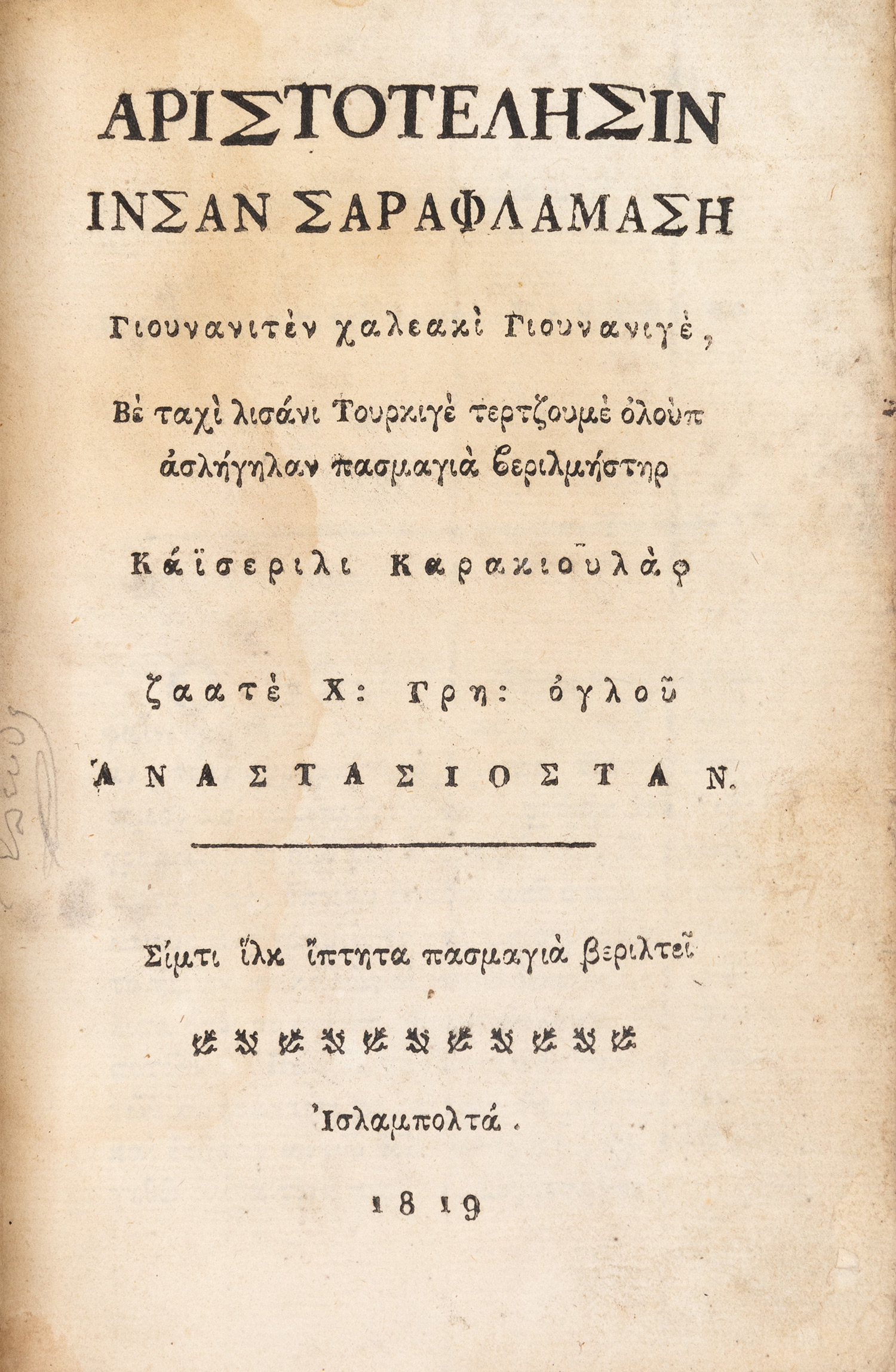 ΚΑΡΑΜΑΝΛΙΔΙΚΟ— Ἀριστοτέλους Φυσιογνωμονικά, μεταφρασθέντα ἀπό τοῦ ἑλληνικοῦ εἰς...