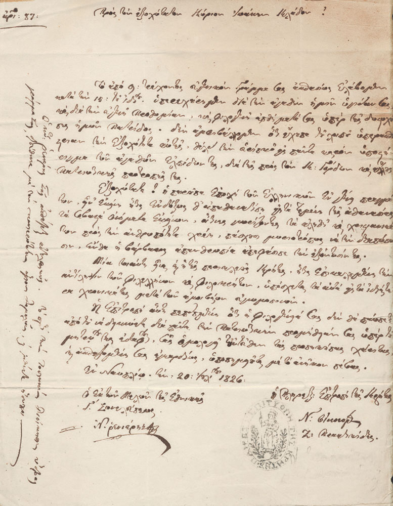 Ἐπιστολή τῶν προκρίτων τῆς Ὕδρας καί τῶν πληρεξουσίων Σπετσῶν καί Ψαρῶν, μέ τίς...