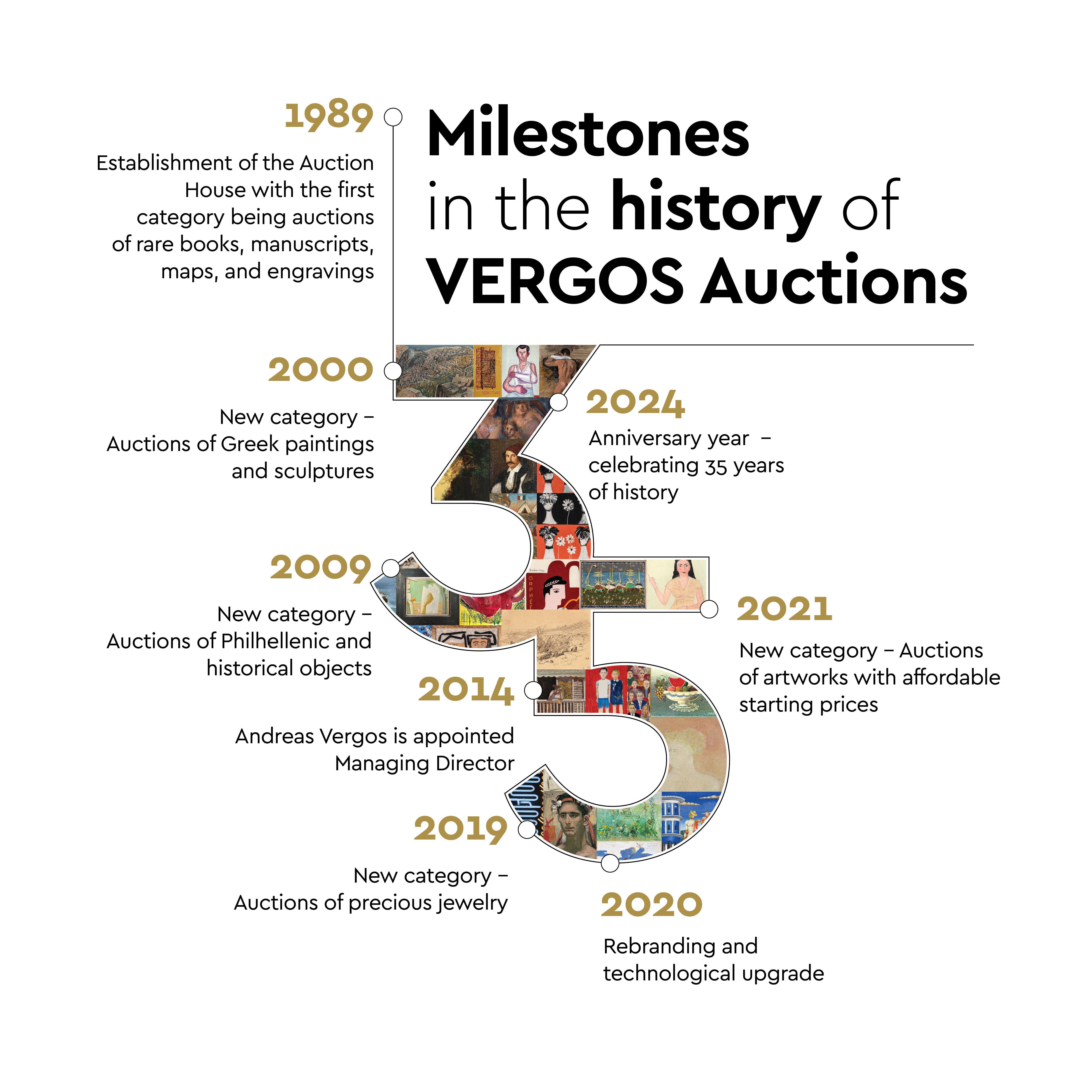 VERGOS Auctions is today the largest and longest-running auction house in Greece, specializing in auctions of artworks, rare books, manuscripts, and maps. The year 2024 was a milestone for the house, as it marks the completion of 35 years of presence in Greek auctions.