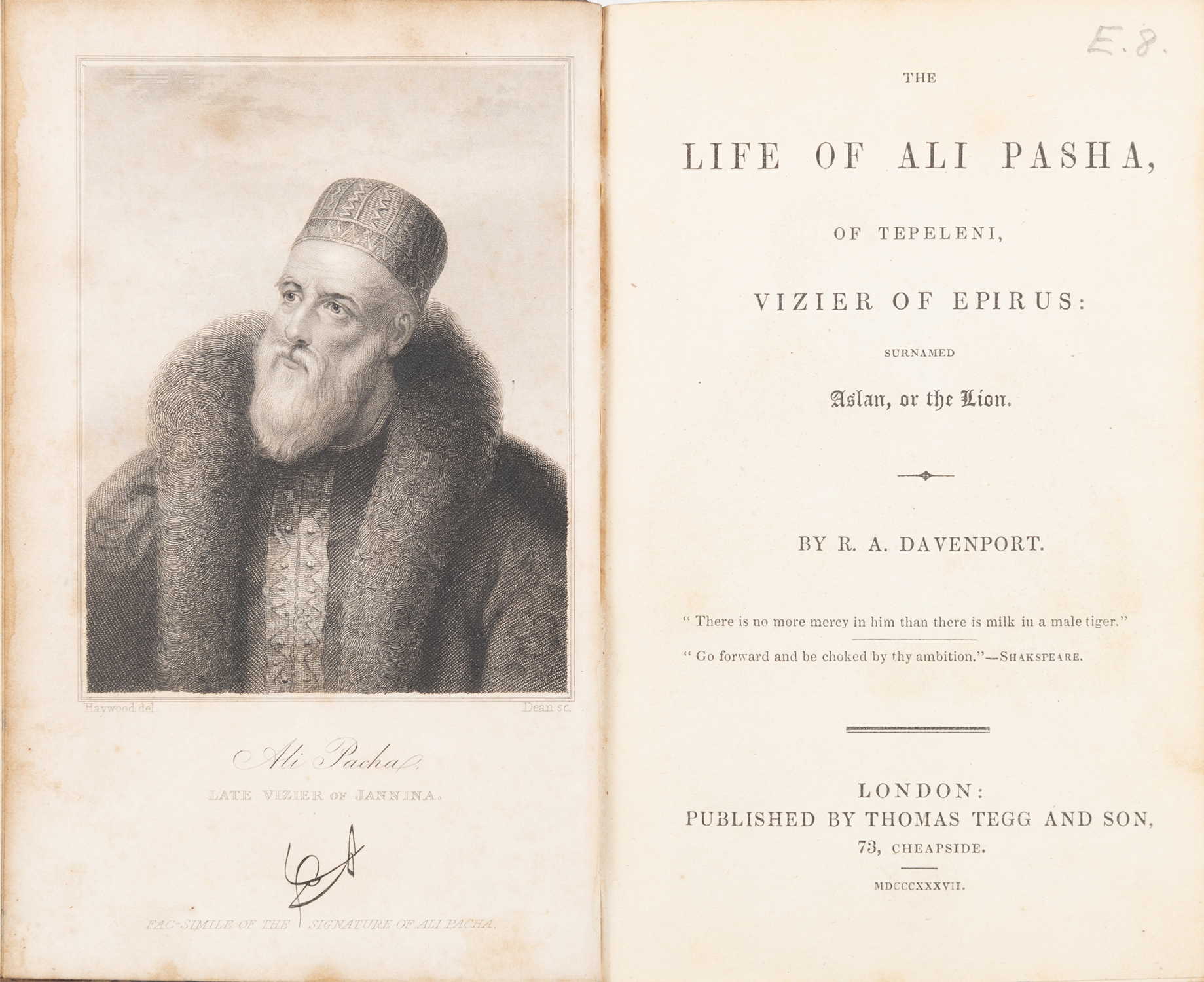 Τιμή εκτίμησης: € 100 - 150ΠΡΩΤΗ ΕΚΔΟΣΗ. 8ο, xii + 418 σ. (λείπει ο ψευδότιτλος). Με ένα χαλκόγραφο πορτραίτο («Ali Pacha / late visier of Jannina»). Δερμάτινη ράχη της εποχής της έκδοσης (μικρές φθορές, μαρμαρογραφημένα τα καλύμματα, τα ακρόφυλλα και οι ακμές, ex-libris John Lubbock).