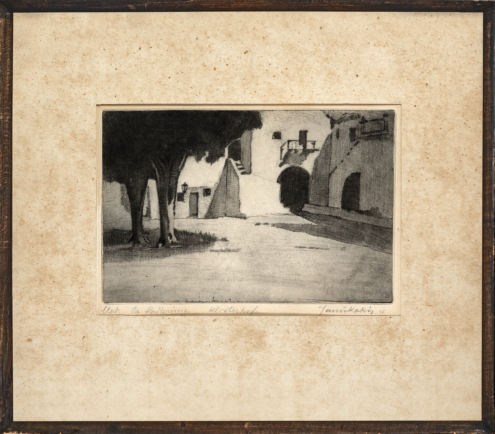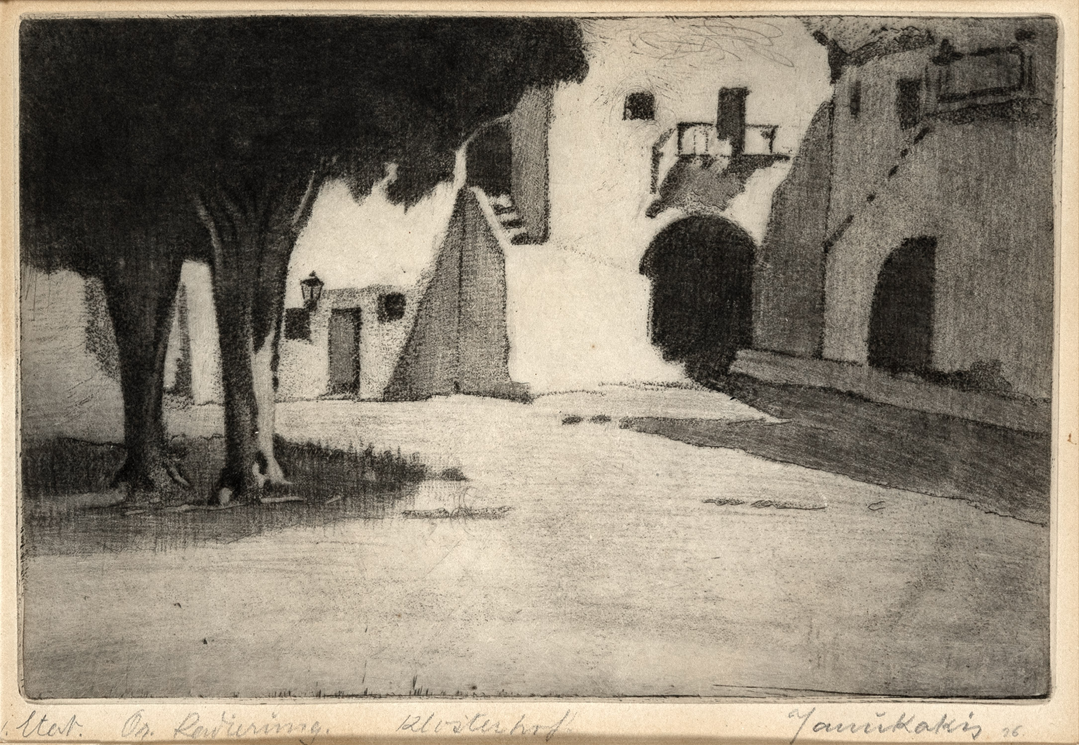 Τιμή εκτίμησης: € 300 - 400Ξεστή χαλκογραφία, 153 x 236 mm. (οξειδωμένο το πασπαρτού). Οι ενδείξεις «Etat» και «Or[iginale] Radierung», τίτλος στα γερμανικά («Klosterhof»), υπογραφή και χρονολογία στο κάτω περιθώριο με μολύβι. Σε κορνίζα.