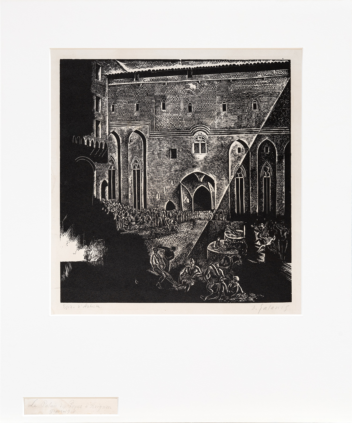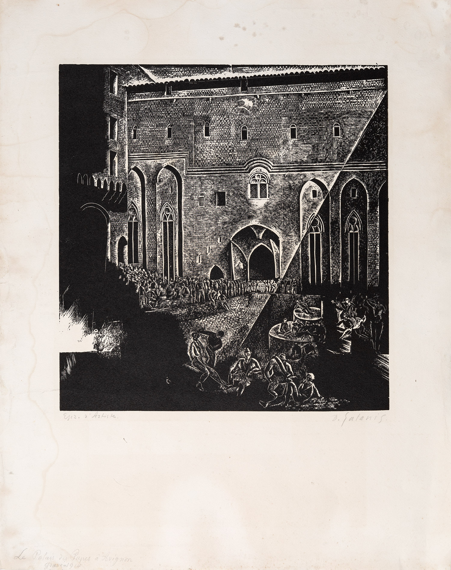 Τιμή εκτίμησης: € 3.000 - 4.000Ξυλογραφία σε όρθιο ξύλο, 340 x 320 mm. (λεκέδες από νερό στα περιθώρια). Η ένδειξη «Epr. d’Artiste» και υπογραφή στο κάτω περιθώριο με μολύβι, τίτλος στα γαλλικά («Le Palais des Papes à Avignon») και η σημείωση «gravé en 1914» στην κάτω αριστερή γωνία του φύλλου. Σε πασπαρτού. • Αντίτυπο τυπωμένο σε χαρτί Arches της ξυλογραφίας που ο Γαλάνης θεωρούσε το αριστούργημά του. Σήμερα σώζεται σε περισσότερα από 15 αντίτυπα σε μουσεία και ιδιωτικές συλλογές. Υπάρχουν ανάμεσά τους κάποια αντίτυπα χωρίς αρίθμηση (μάλλον τα πρωιμότερα), ενώ άλλα φέρουν αρίθμηση στα 20 ή στα 25.