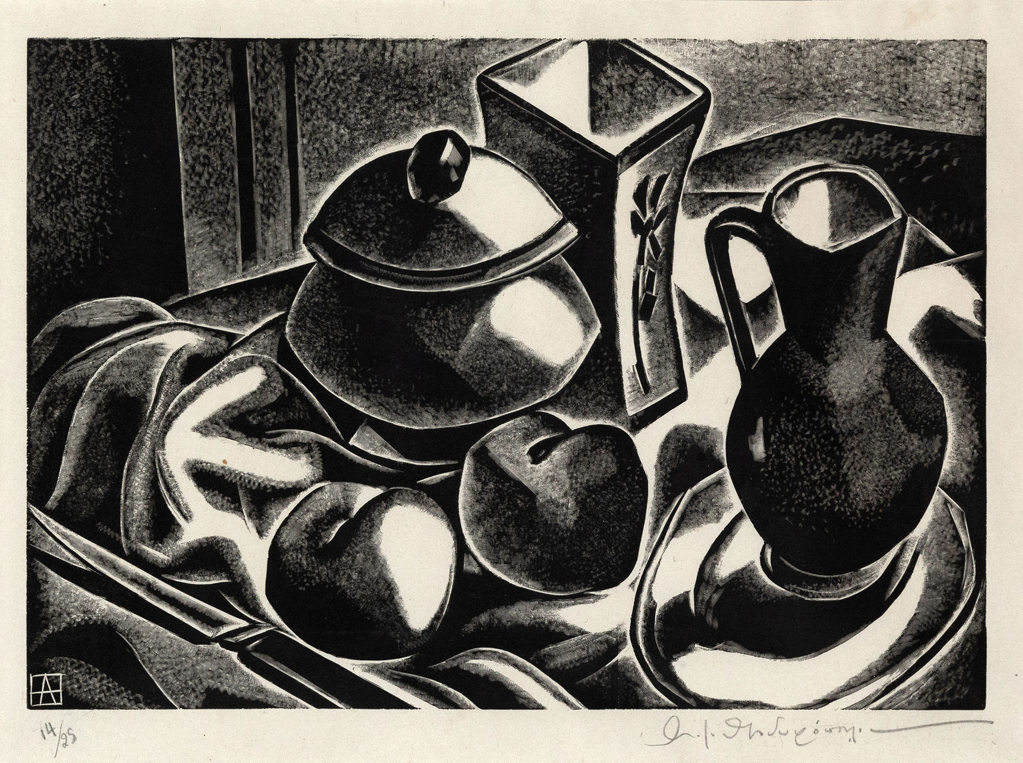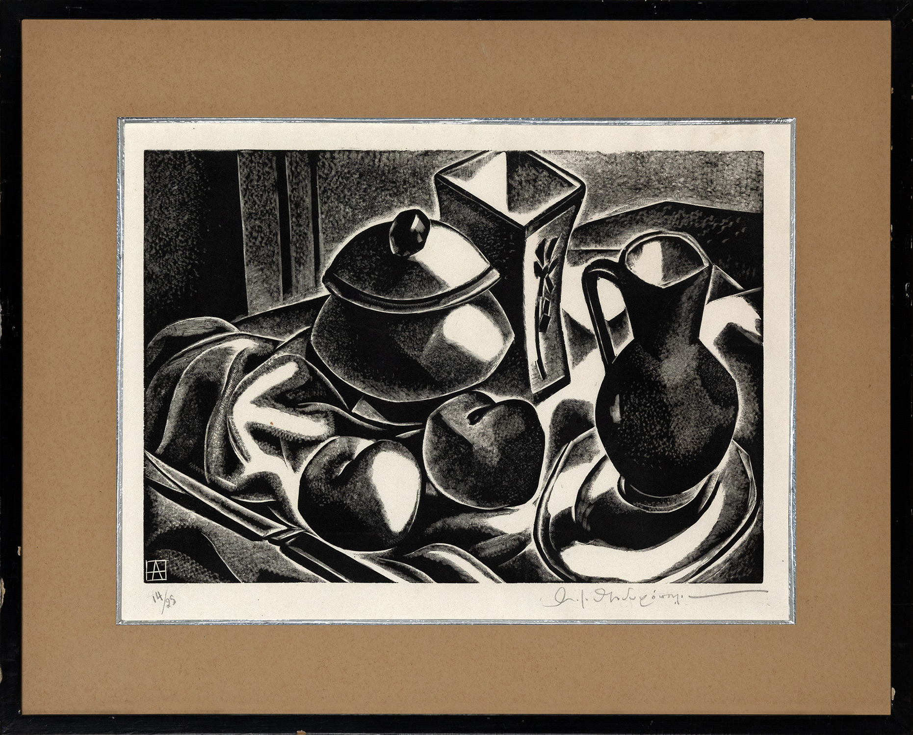 Ξυλογραφία σε όρθιο ξύλο, 240 x 348 mm. Έκδοση σε 25 αντίτυπα, αρίθμηση και υπογραφή στο κάτω περιθώριο με μολύβι, υπογραφή με μονόγραμμα στην πλάκα. Σε κορνίζα. Δεληβορριάς Ξ113.