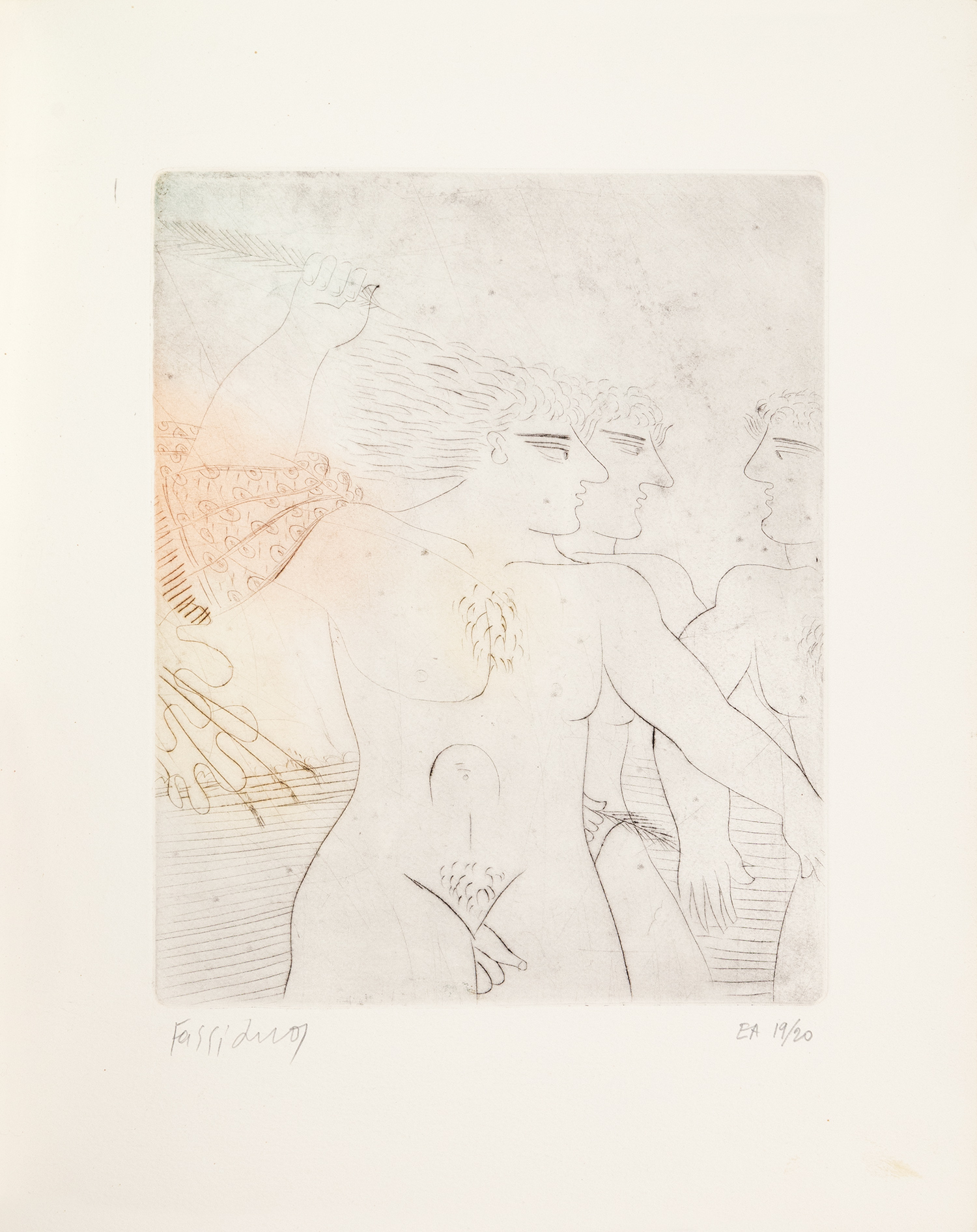 Τιμή εκτίμησης: € 150 - 200385 x 310 mm., [8] σ. Έκδοση περιορισμένη σε 60 αριθμημένα αντίτυπα (συν 20 αριθμημένα αντίτυπα με την ένδειξη «E. A»), με μία έγχρωμη οξυγραφία του Αλέκου ΦΑΣΙΑΝΟΥ, αριθμημένη, και υπογεγραμμένη από τον καλλιτέχνη, όλα τα αντίτυπα υπογεγραμμένα από τον ποιητή, σε άρραφα φύλλα (όπως κυκλοφόρησε). Αρχικά εικονογραφημένα εξώφυλλα.