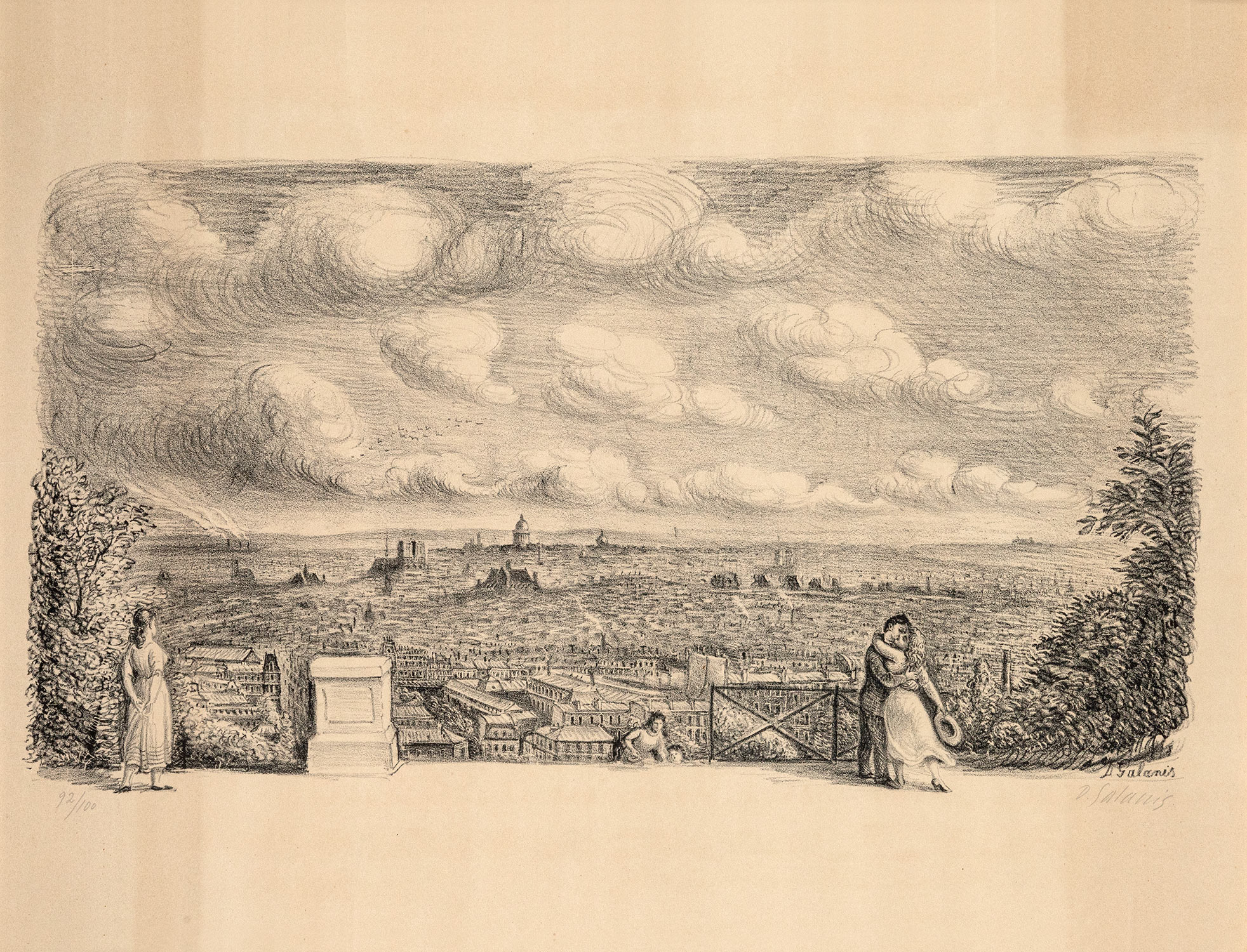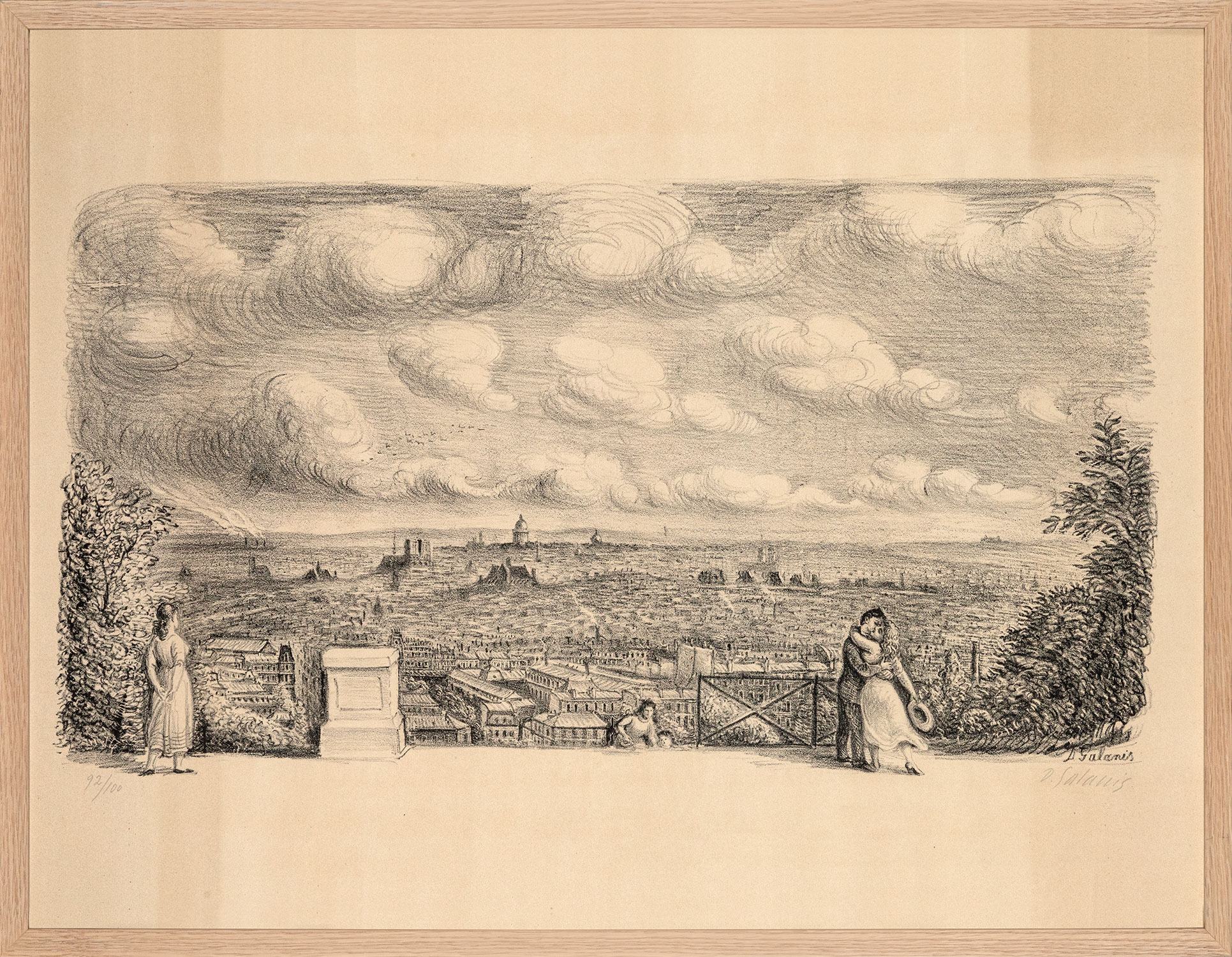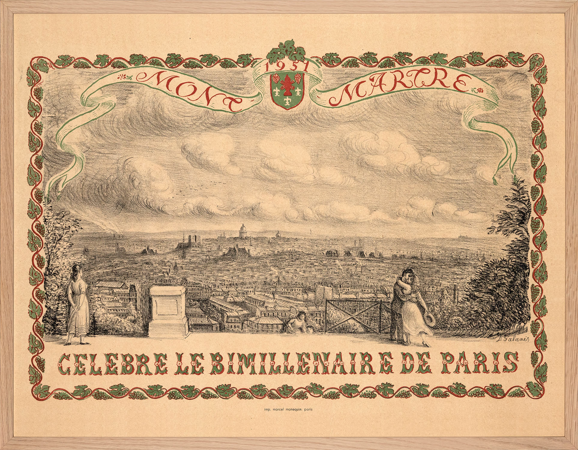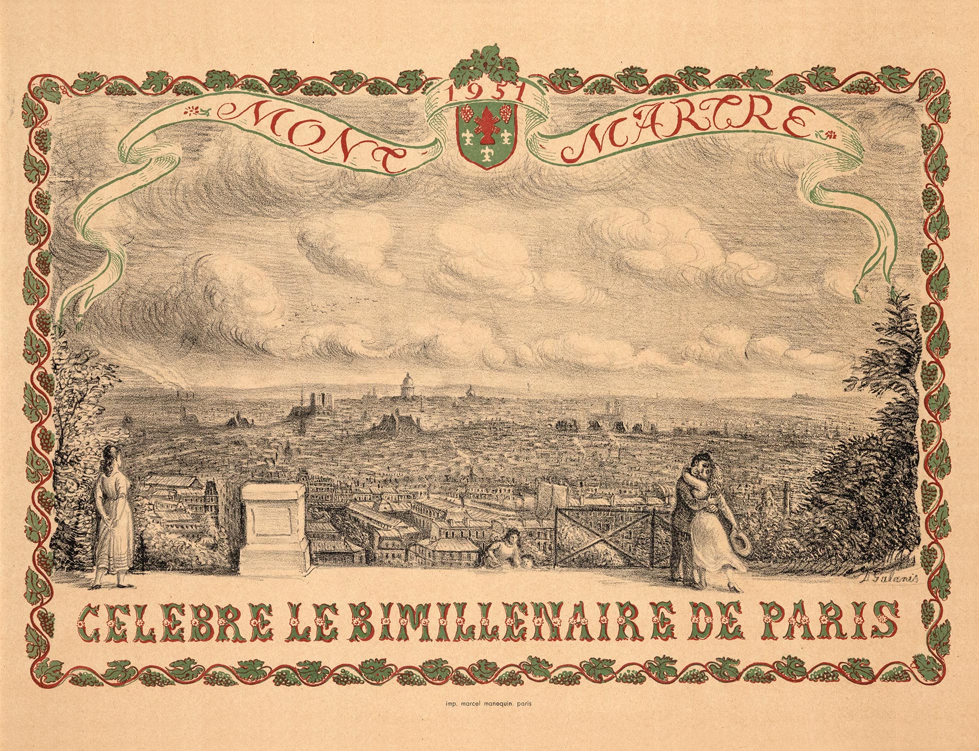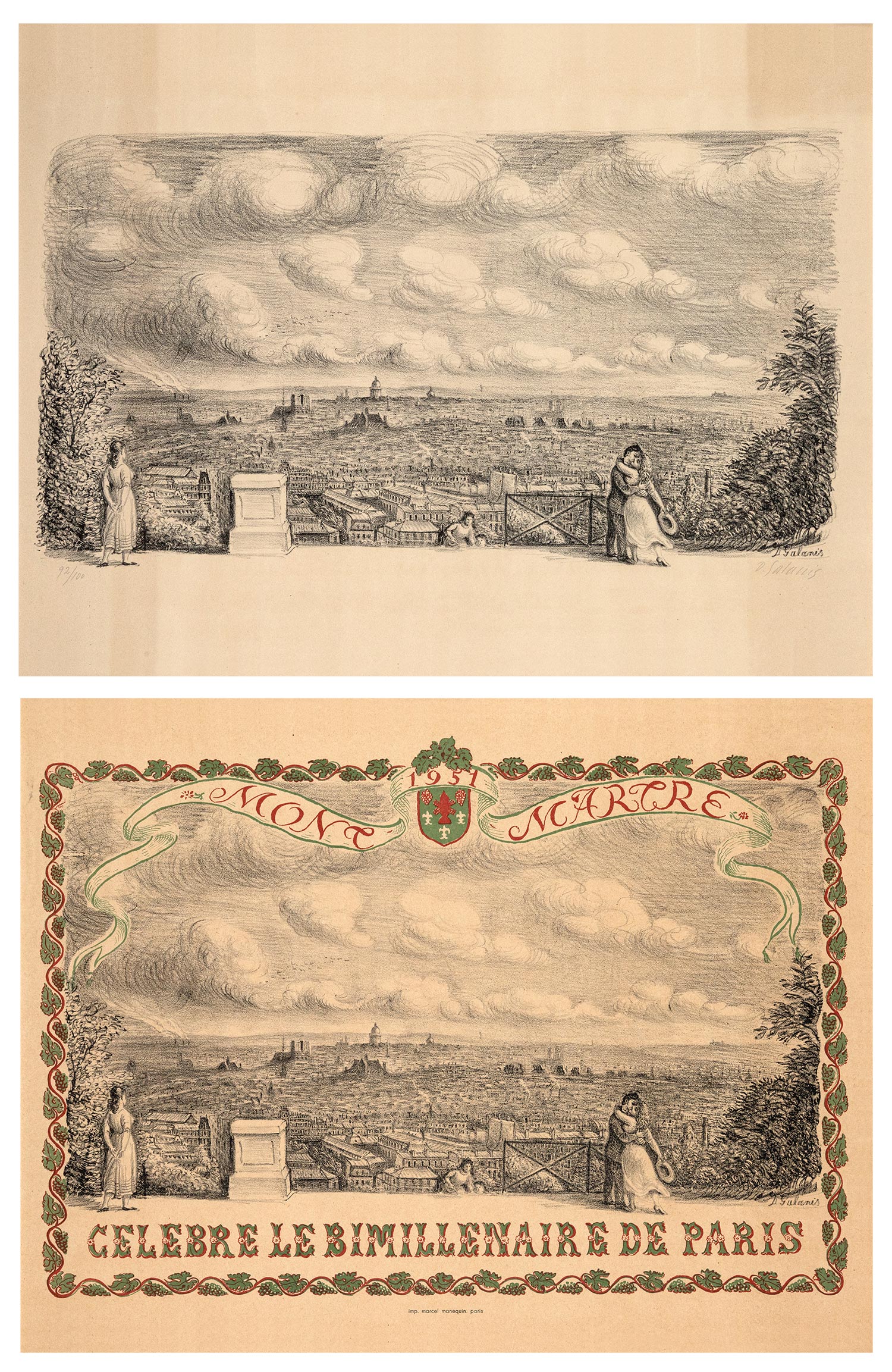 Τιμή εκτίμησης: € 800 - 1.200Λιθογραφία, 320 x 600 mm. Έκδοση σε 100 αντίτυπα, αρίθμηση και υπογραφή στο κάτω περιθώριο με μολύβι, υπογραφή στην πλάκα. Σε κορνίζα. Μαζί χρωμολιθόγραφη αφίσα που ενσωματώνει τη λιθογραφία, 490 x 638 mm. Παρίσι, M. Manequin, [1951]. Σε κορνίζα. • Η αφίσα τυπώθηκε για τον εορτασμό της δεύτερης χιλιετηρίδας της πόλης του Παρισιού. (2)