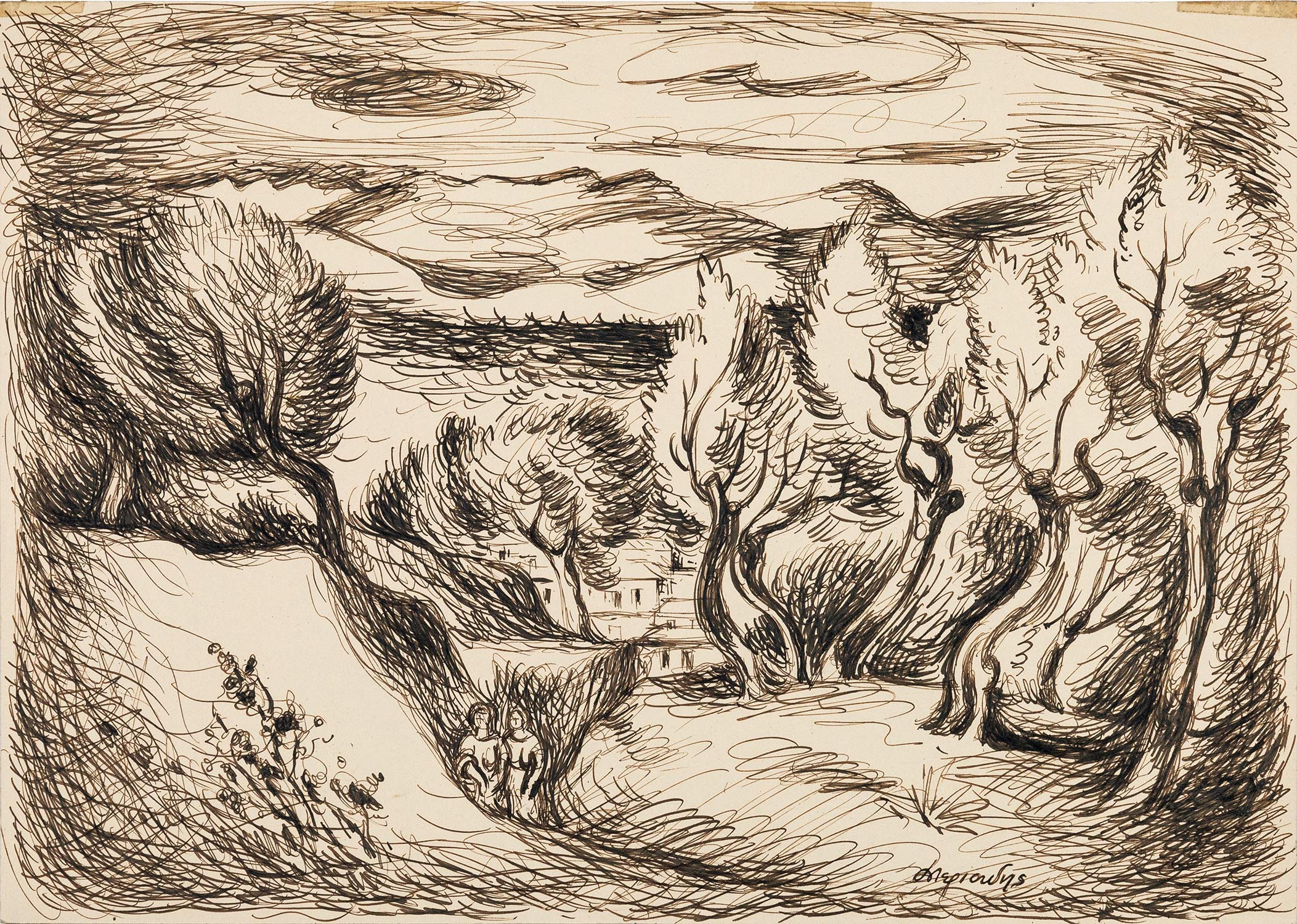 Μελάνι σε χαρτί, 300 x 453 mm. Υπογεγραμμένο κάτω δεξιά: «αστεριάδης».