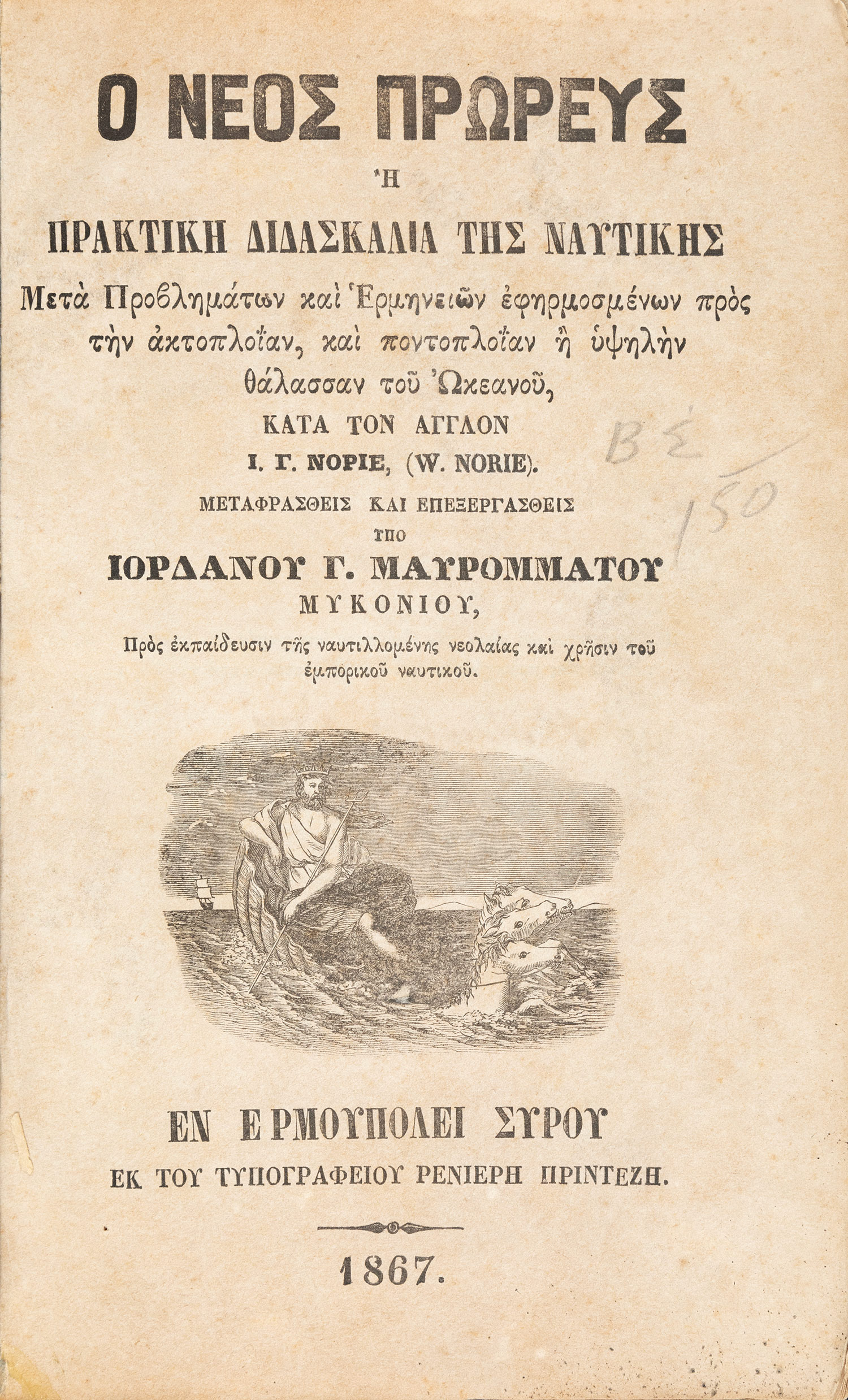 Ὁ νέος Πρωρεὺς ἢ πρακτικὴ διδασκαλία τῆς ναυτικῆς, μετὰ προβλημάτων καὶ ἑρμηνειῶν ἐφηρμοσμένων πρὸς τὴν ἀκτοπλοΐαν καὶ ποντοπλοΐαν ἢ ὑψηλὴν θάλασσαν τοῦ ὠκεανοῦ, μεταφρασθεῖς καὶ ἐπεξεργασθεὶς ὑπό Ἰορδάνου Γ. Μαυρομμάτου.