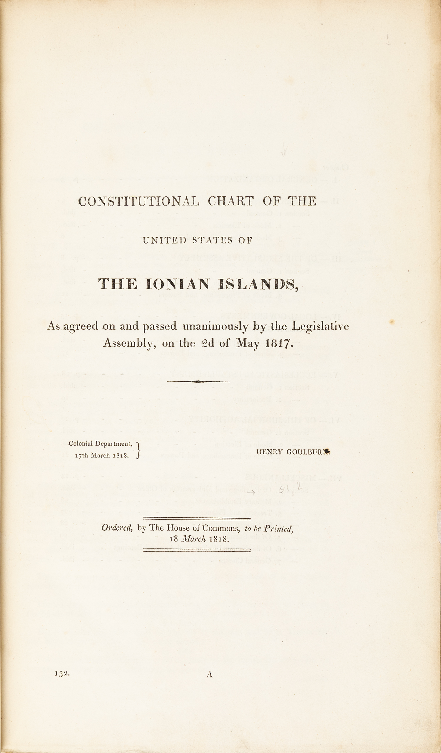 Constitutional chart of the United States of the Ionian Islands, as agreed on and passed unanimously by the Legislative Assembly, on the 2d of May 1817.