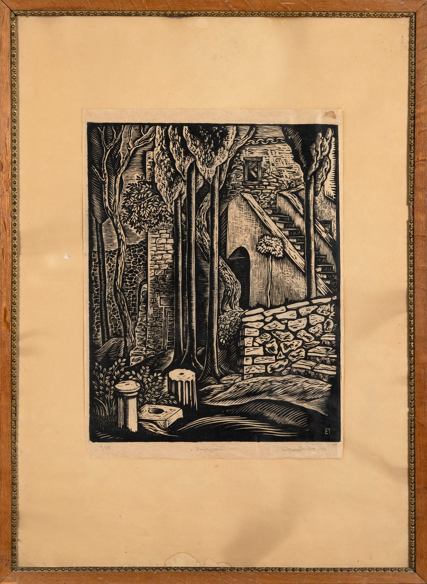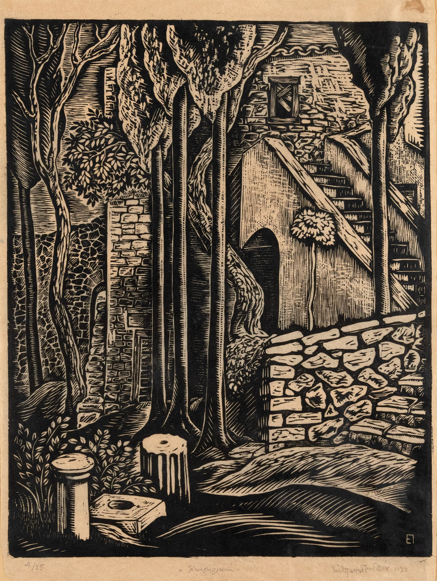 Ξυλογραφία σε πλάγιο ξύλο, 300 x 380 mm. Έκδοση σε 25 αντίτυπα, αρίθμηση, τίτλος, υπογραφή και χρονολογία στο κάτω περιθώριο με μολύβι, υπογραφή με μονόγραμμα στην πλάκα. Σε κορνίζα.