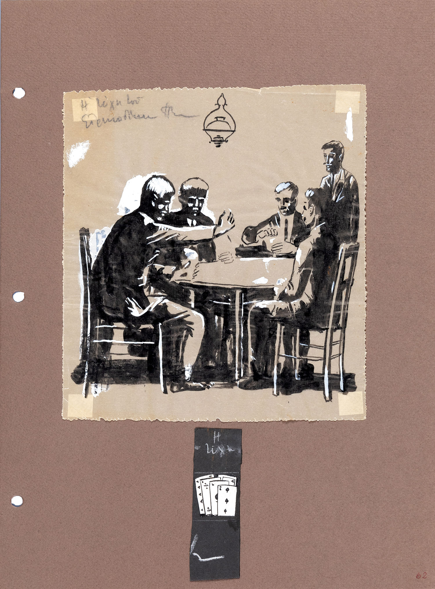 Μακέτα ἐξωφύλλου καί 76 σχέδια (ἀνάμεσά τους 32 ἀρχικά καί βινιέτες) γιά τήν εἰκονογράφηση τῶν «Διηγημάτων» τοῦ Ζαχ. Παπαντωνίου.