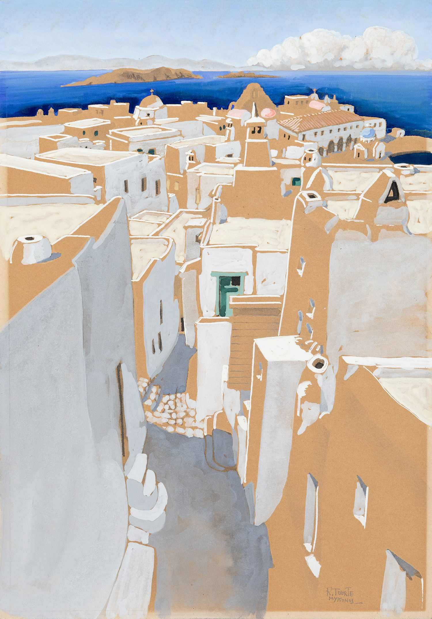 Τέμπερα σε χαρτί, 305 x 211 mm. Υπογραφή και τίτλος κάτω δεξιά: «R. TOURTE / MYKONOS».