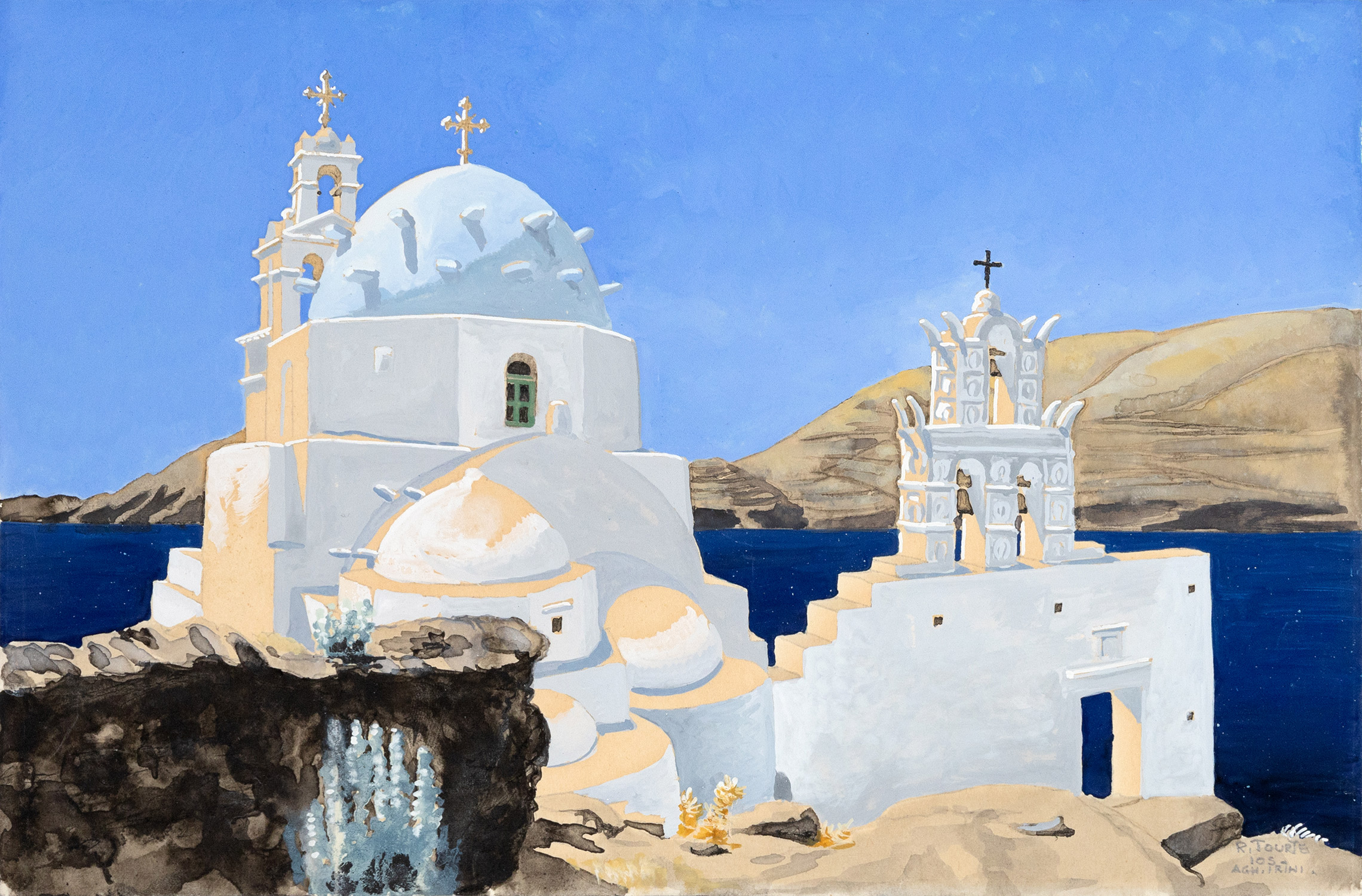 Τέμπερα σε χαρτί, 200 x 300 mm. Υπογραφή και τίτλος κάτω δεξιά: «R. TOURTE / IOS / AGH. IRINI».