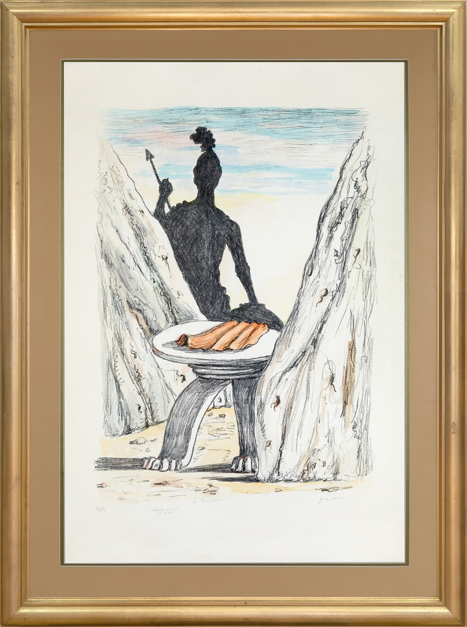 Τιμή εκτίμησης: € 800 - 1.200Λιθογραφία επιχρωματισμένη με το χέρι, 780 x 560 mm. Έκδοση σε 90 αντίτυπα, αρίθμηση, η σημείωση «“colorata a mano / dall’autore”», τίτλος («Le Termopili») και υπογραφή στο κάτω περιθώριο με μολύβι. Σε κορνίζα.