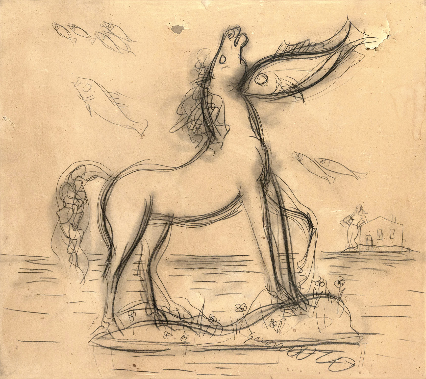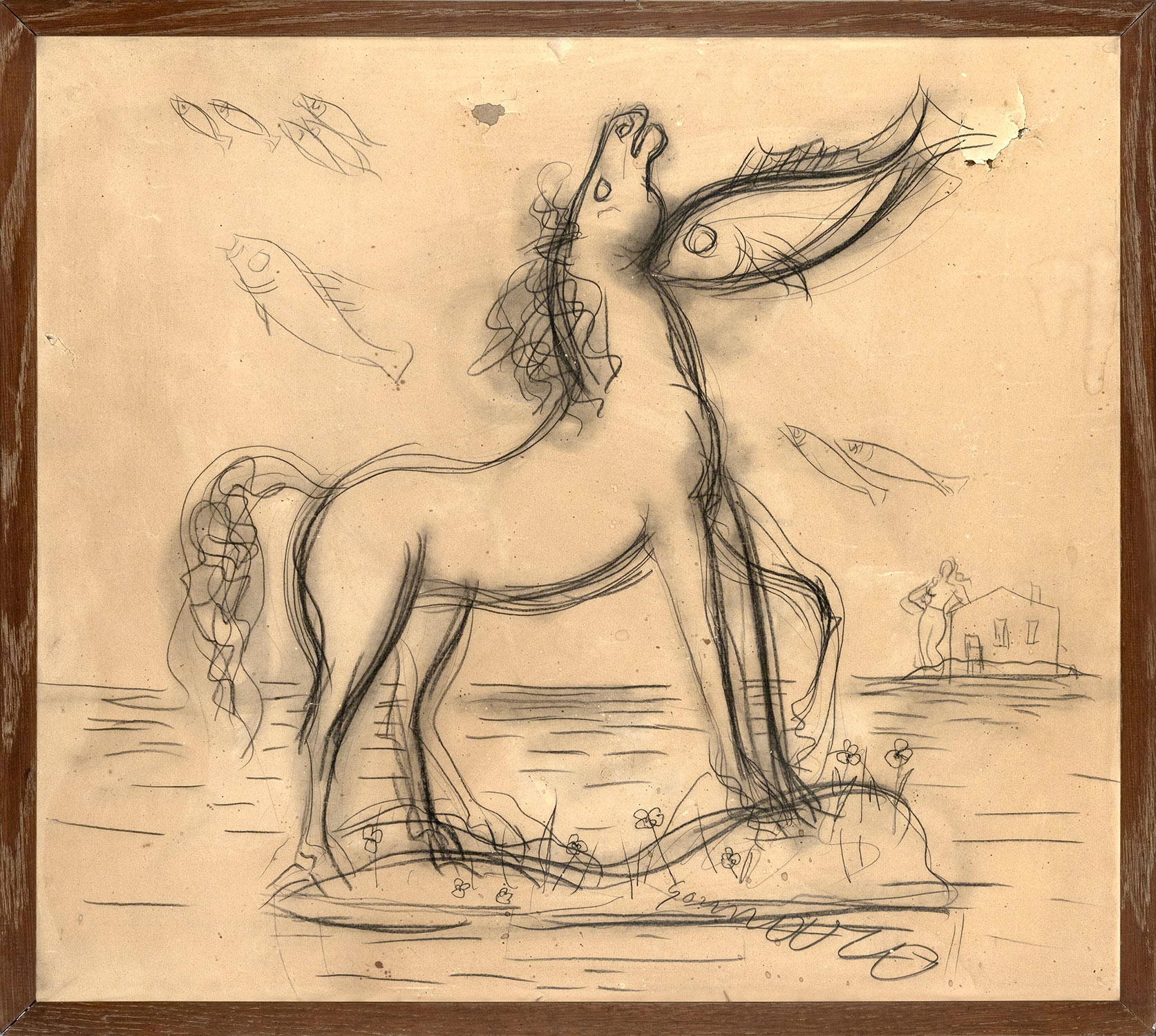 Τιμή εκτίμησης: € 800 - 1.200Κάρβουνο σε χαρτί, 670 x 760 mm. Υπογεγραμμένο κάτω δεξιά: «Gounaro». Σε κορνίζα. • Πιθανώς προσχέδιο ελαιογραφίας, βλ. Ἀναδρομική ἔκθεση Γ. Γουναρόπουλου, G. Gounaro, Εθνική Πινακοθήκη, Μουσείον Αλεξάνδρου Σούτσου, Αθήνα 1975, αρ. 30 (Ψάρι πού τρυπᾶ ἄλογο καί γυναικεῖα μορφή πάνω σέ βράχο. 1935. Ελαιογραφία, 125 x 119 cm.).
