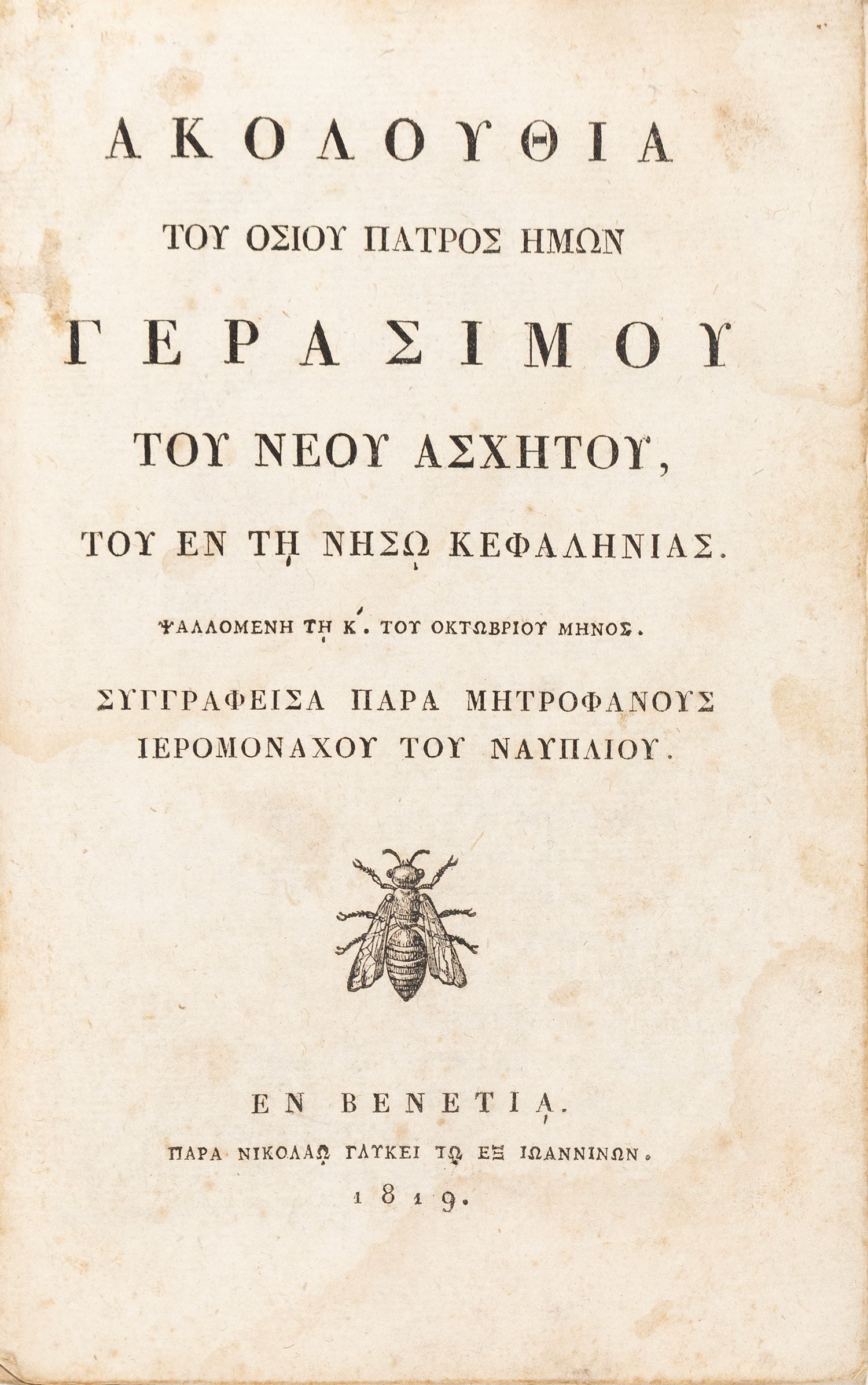 Ἀκολουθία τοῦ ὁσίου πατρός ἡμῶν Γερασίμου, τοῦ νέου ἀσχητοῦ, τοῦ ἐν τῇ νήσῳ Κεφαληνίας. Ψαλλομένη τῇ κ´. τοῦ Ὀκτωβρίου μηνός.