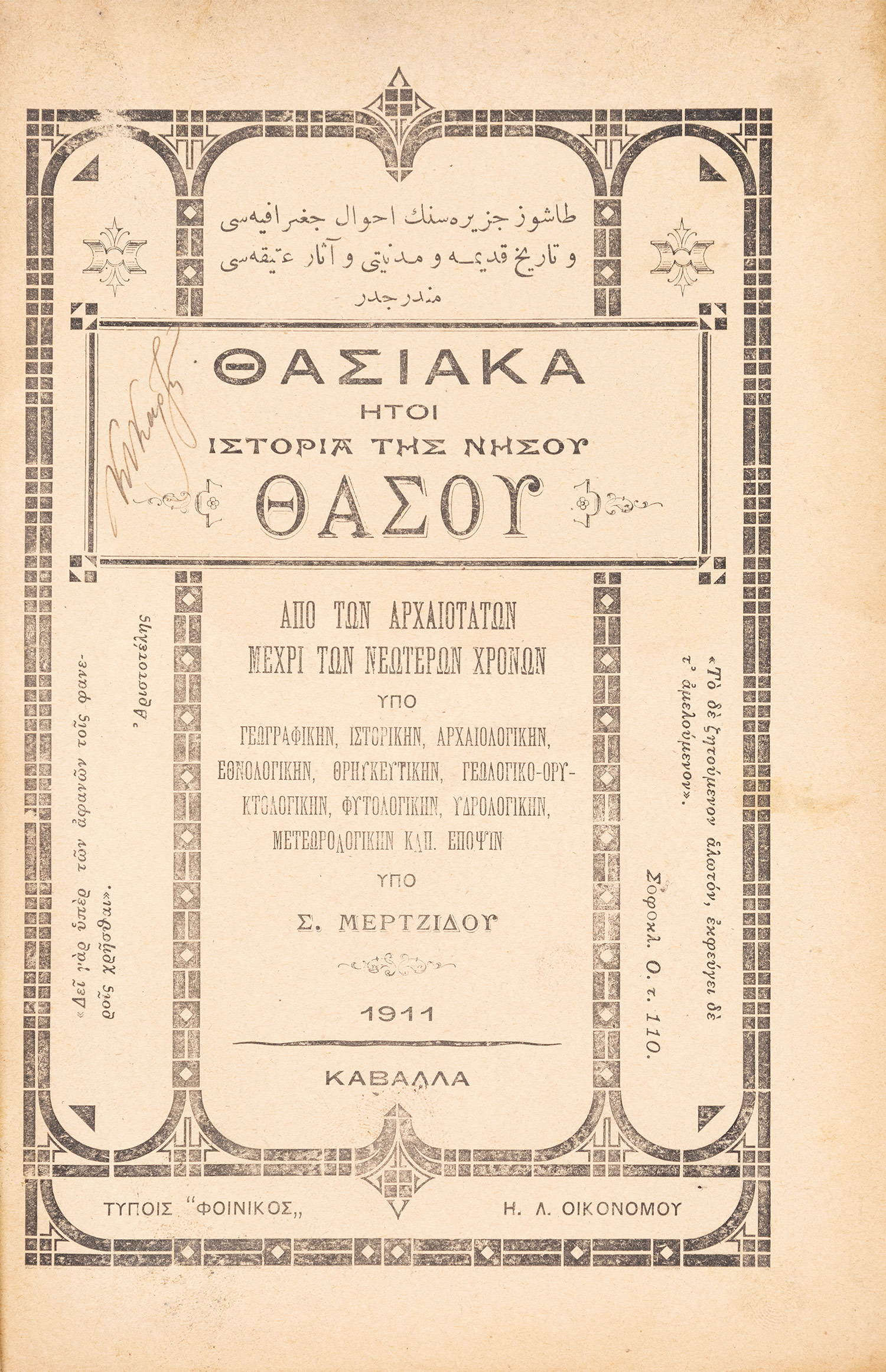 Θασιακά, ἤτοι ἱστορία τῆς νήσου Θάσου, ἀπὸ τῶν ἀρχαιοτάτων μέχρι τῶν νεωτέρων χρόνων, ὑπὸ γεωγραφικήν, ἱστορικήν, ἀρχαιολογικήν, ἐθνολογικήν, θρησκευτικήν, γεωλογικό-ὀρυκτολογικήν, φυτολογικήν, ὑδρολογικήν, μετεωρολογικὴν κλπ. ἔποψιν.