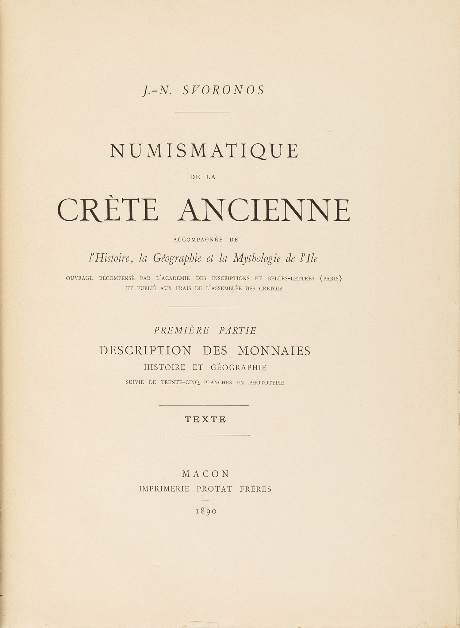 Numismatique de la Crète ancienne, accompagnée de l'histoire, la géographie et la mythologie de l'île. Première partie (δεν εκδόθηκε άλλο). Texte [—planches].