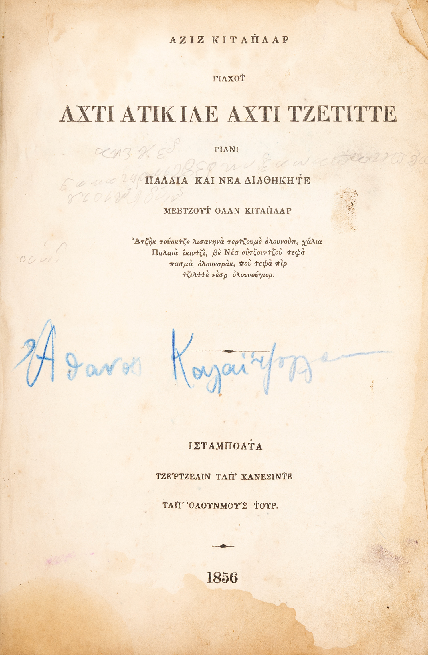 ΚΑΡΑΜΑΝΛΙΔΙΚΟ — Ἀζὶζ Κιταπλάρ Γιάχοτ ἄχτι ἀτὶκ ἰλὲ τζετιττὲ γιάνι Παλαιὰ καὶ Νέα Διαθήκητε μεβτζουτ ολαν κιταπλαρ Ἀτζὴκ τούρκτζε λισανηνά τερτζουμὲ ὀλουνούπ, χάλια Παλαιά ἰκιντζί, βὲ Νέα οὐτζουντζοὺ τεφά πασμά ὀλουνουράκ, ποὺ τεφά πὶρ τζιλττὲ νὲσρ ὀλουνούγιορ [—Ἄχτι Τζετὶτ Καινὴ Διαθήκη, Γιάνι Ραππιμὶζ βὲ χελαστζημὴζ Ἰησοῦς Χριστοσοὺν γενὶ βασιέτι κι Ἰντζίλι Σερίφ, Ρεσουλλαρὴν ἀμελλερὶ βὲ μεκτουπλαρή, χὲμ Ἀποκάλυψις τιρ].