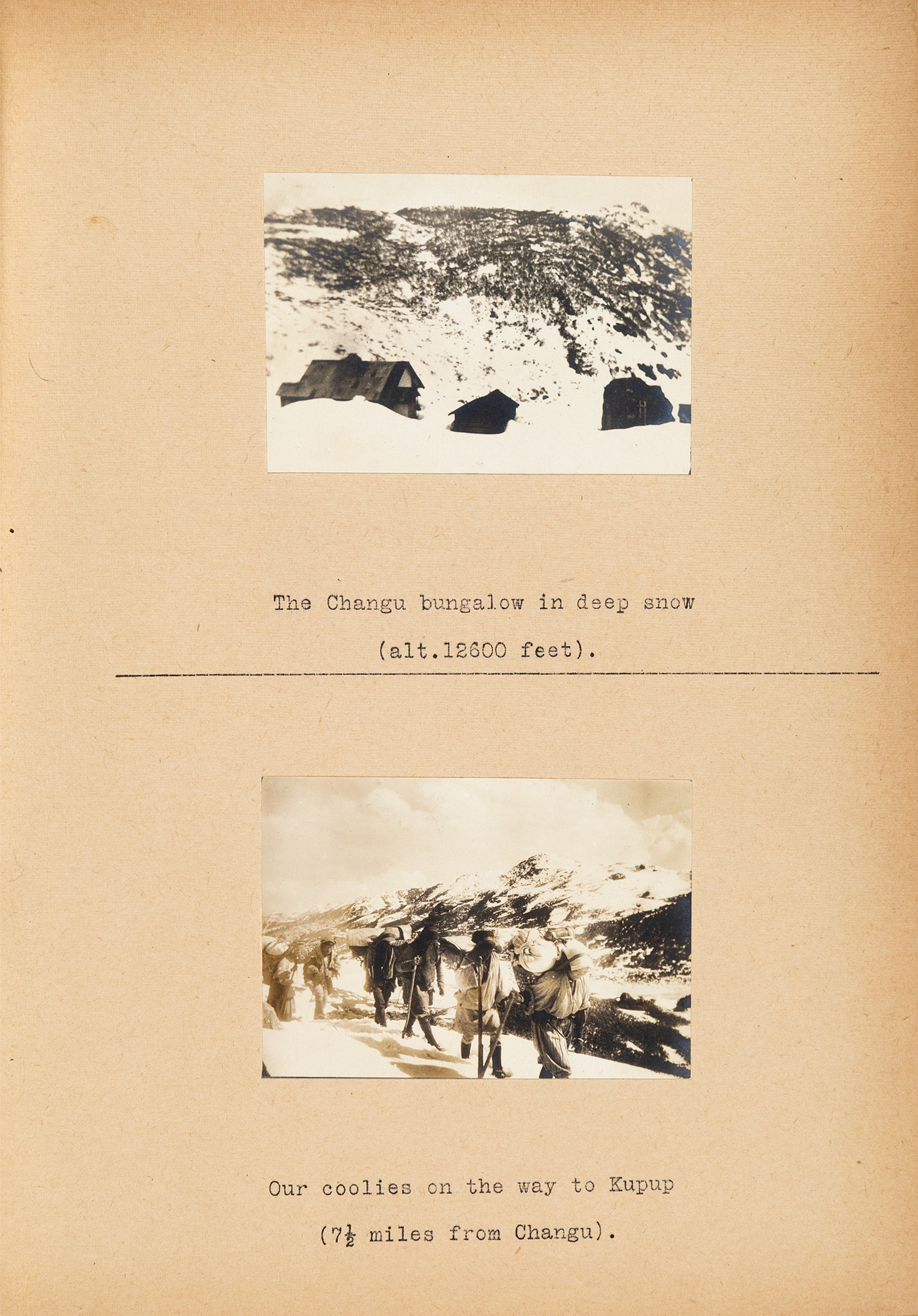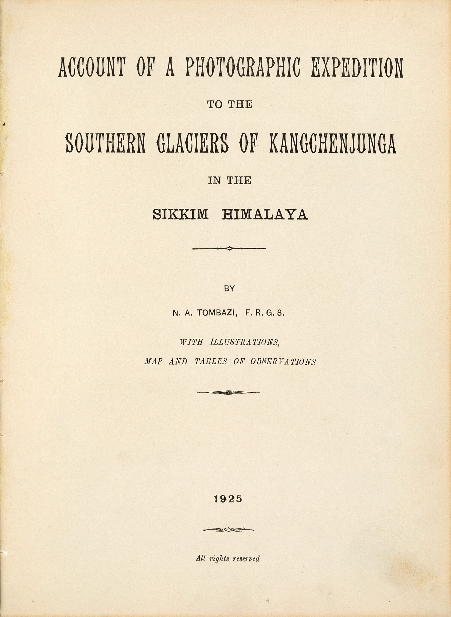 Τιμή εκτίμησης: € 400 - 600Έκδοση περιορισμένη σε 150 αριθμημένα αντίτυπα, υπογεγραμμένα και χρονολογημένα από τον φωτογράφο. 252 x 196 mm, 73 + 2 + 5 σ. Με 60 πρωτότυπες φωτογραφίες, επικολλημένες από 1 έως 2 σε λευκά φύλλα εκτός κειμένου, τυπώματα αργύρου, 75 x 98 mm. (δύο μεγαλύτερα: 111 x 147 και 159 x 115 mm., και ένα στρογγυλού σχήματος με διάμετρο 75 mm., ανάμεσά τους δύο πανοράματα, αποτελούμενα από δύο τυπώματα), έντυπες λεζάντες. Στο τέλος μία φωτογραφική αναπαραγωγή χάρτη, 294 x 205 mm., τοποθετημένη σε θήκη στο εσωτερικό του κάτω καλύμματος και δύο αναδιπλούμενοι πίνακες. Αρχική πάνινη ράχη (μικρές φθορές). [μαζί:] ΤΟΜΠΑΖΗΣ, Νικόλαος και Σ. Βλαστός (Stephen Vlasto). Tours in Darjeeling and Sikkim. [1919]. • 252 x 196 mm, 59 σ. 32 λυτά φύλλα δακτυλόγραφου κειμένου και 5 λυτά χαρτόνια με 20 επικολλημένες πρωτότυπες φωτογραφίες (4 ανά χαρτόνι), φωτοτυπίες (collotypes), 56 x 82 mm. και αντίστροφα, έντυπες λεζάντες, όλα με 2 τρύπες από διατρητική μηχανή στο αριστερό περιθώριο. Αρχικά απλά εξώφυλλα (φθορές στη ράχη, λείπει το κορδόνι που συγκρατούσε την έκδοση). • Δύο ΠΟΛΥ ΣΠΑΝΙΑ ΛΕΥΚΩΜΑΤΑ, στα οποία αναδύεται γλαφυρά η διπλή ιδιότητα του Νικόλαου Τομπάζη, ως φωτογράφου και ορειβάτη-εξερευνητή. (2)