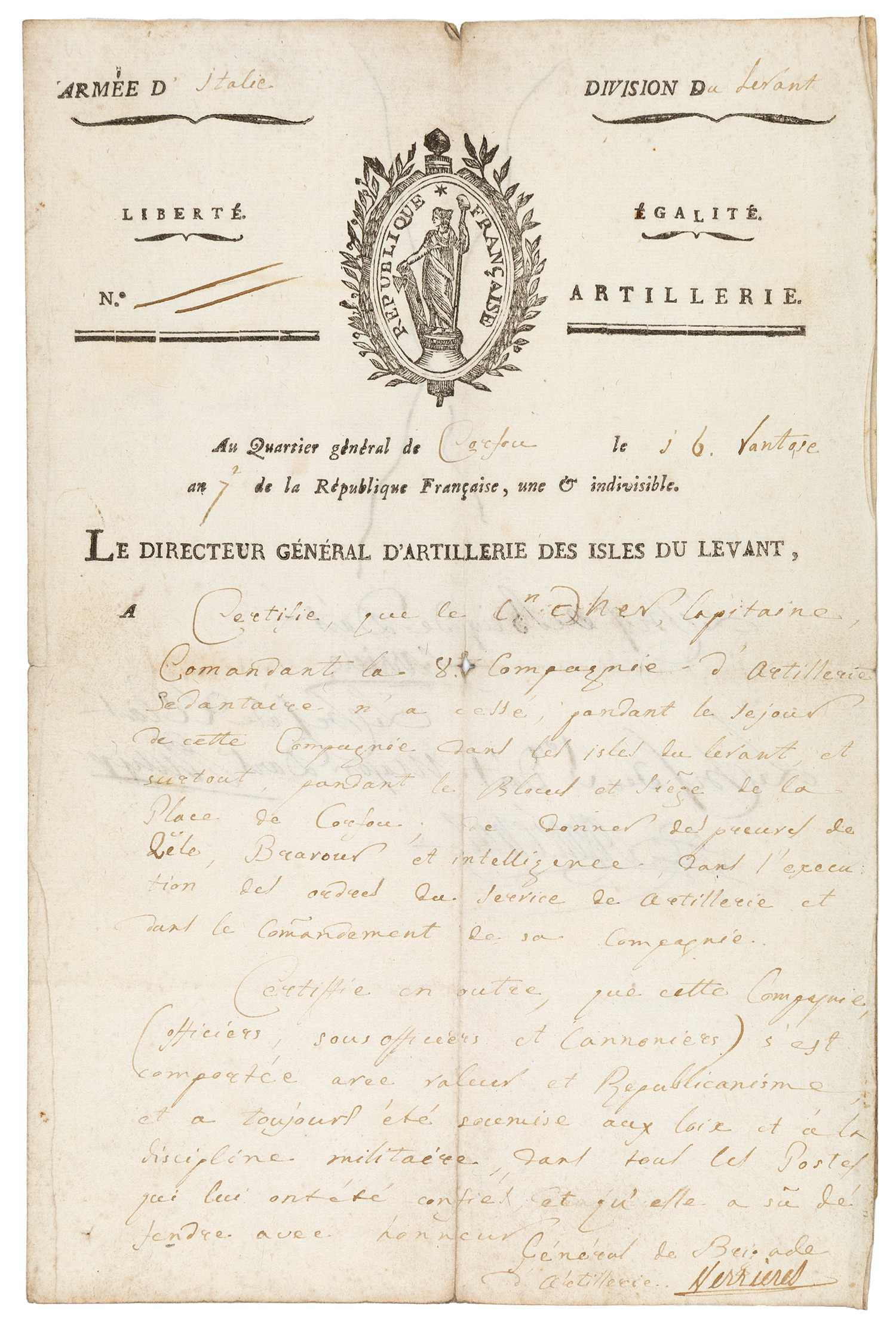 ARMÉE D’Italie, DIVISION Du Levant. Au quartier général de Corfou le 16 Vantose an 7 de la République Française, une & indivisible. LE DIRECTEUR GÉNÉRAL D’ARTILLERIE DES ISLES DU LEVANT, A Certifie que le Cn Dher, Capitaine, comandant la 8.e Compagnie d’artillerie sedantaire n’a cessé, pandant le sejour de cette Compagnie dans les isles du levant, et surtout pandant le Blocus et Siège de la Place de Corfou, de donner des preuves de zële, Bravour et intelligence, dans l’execution des ordres du service de artillerie et dans le comandement de sa Compagnie. [τελειώνει:] Général de Brigade d'artillerie.. Verrières.