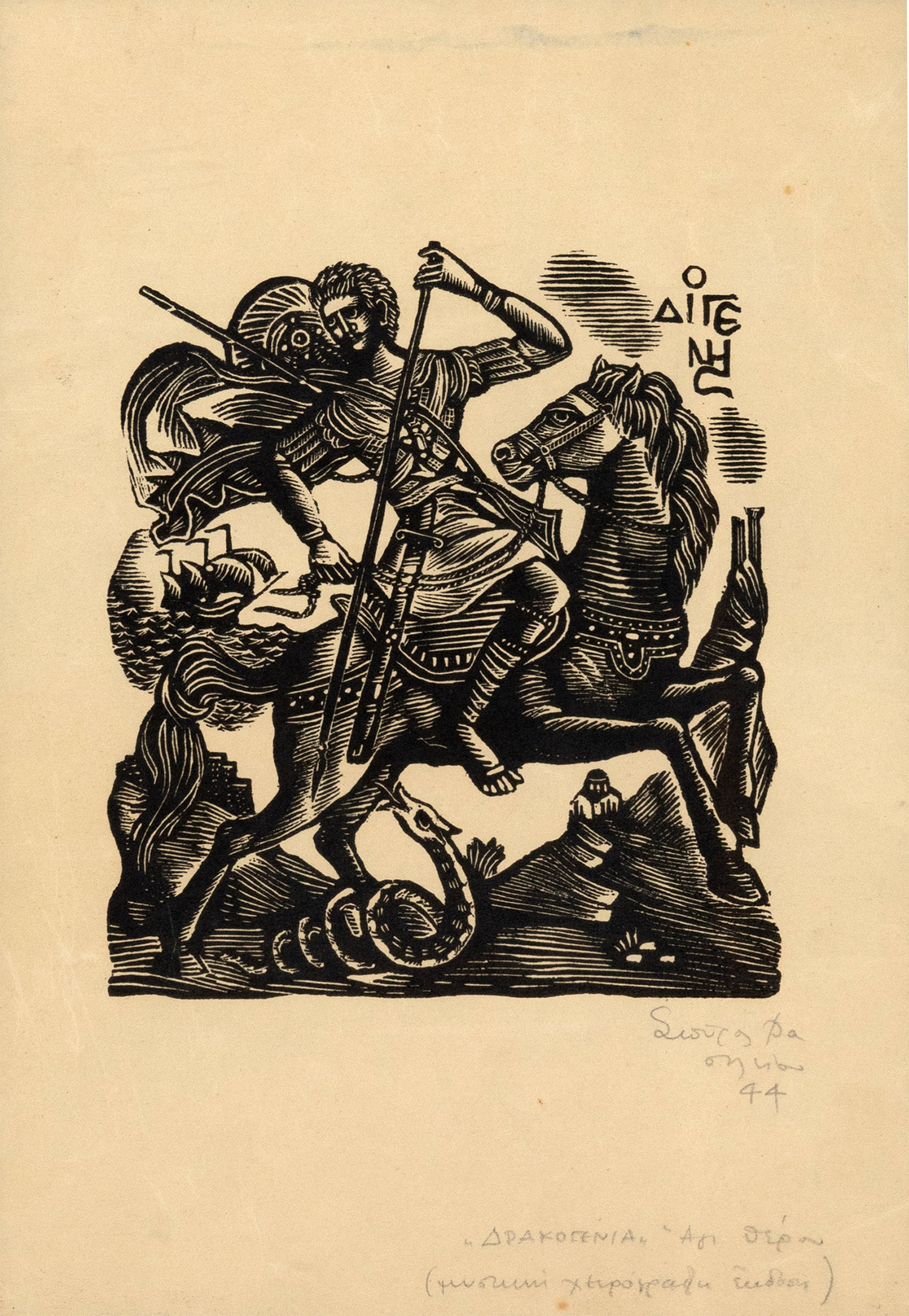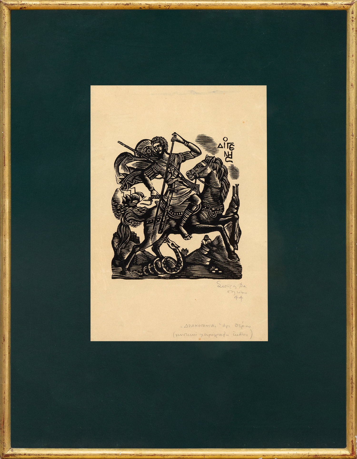 Τιμή εκτίμησης: € 200 - 300Ξυλογραφία, 140 x 125 mm. Υπογραφή, χρονολογία και η σημείωση: «”Δρακογενιά” Ἅγι Θέρου / (μυστική χειρόγραφη ἔκδοση)» στο κάτω περιθώριο με μολύβι. Σε κορνίζα. • Χωριστό τύπωμα ξυλογραφίας από την περιορισμένη σε 105 αριθμημένα αντίτυπα έκδοση του Άγι Θέρου, Δρακογενιά (Αθήνα 1943).