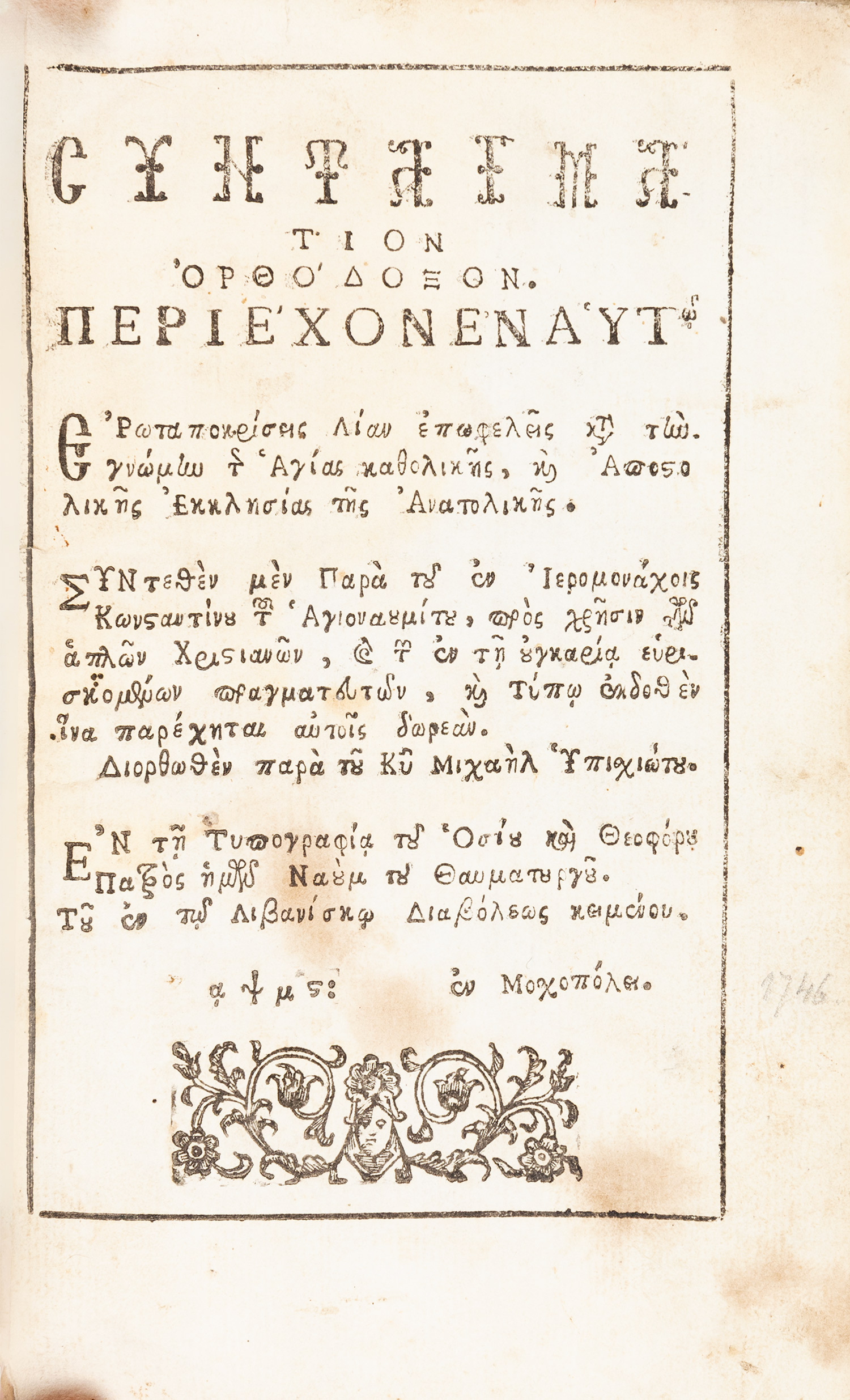 Συνταγμάτιον ὀρθόδοξον, περιέχον ἐν αὐτῷ ἐρωταποκρίσεις λίαν ἐπωφελεῖς κατὰ τὴν γνώμην τῆς ἁγίας καθολικῆς, καὶ άποστολικῆς ἐκκλησίας τῆς ἀνατολικῆς. Συντεθὲν μὲν παρὰ τοῦ ἐν ἱερομονάχοις Κωνσταντίνου τοῦ ἁγιοναουμίτου, πρὸς χρῆσιν τῶν ἁπλῶν χριστιανῶν, καὶ τῶν ἐν τῇ οὐγκαρία εὑρισκομένων πραγματευτῶν, καὶ τὺπῳ ἐκδοθὲν ἵνα παρέχηται αὐτοῖς δωρεάν, διορθωθὲν παρὰ τοῦ Κῦ Μιχαὴλ Ὑπισχιώτου.