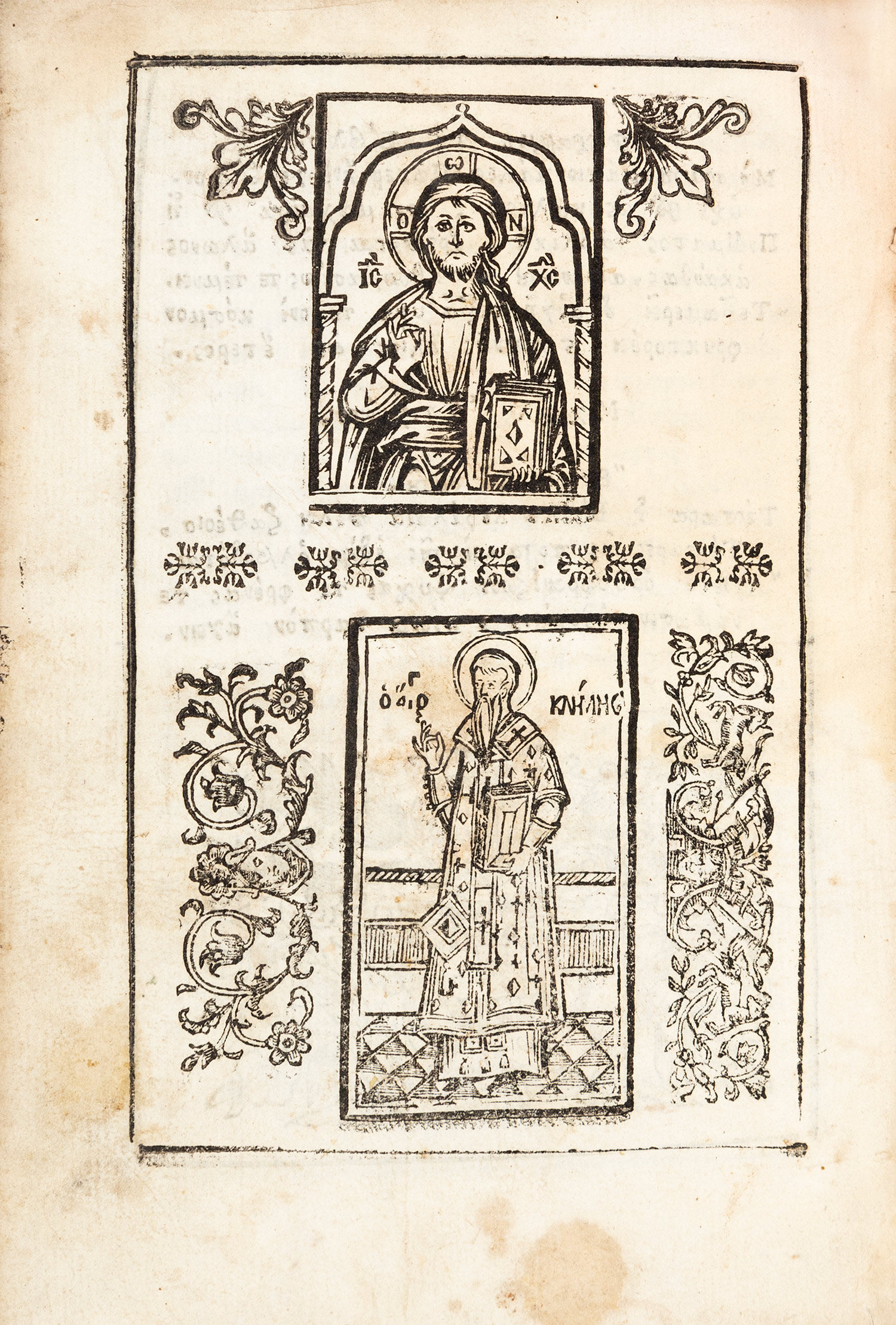 Τιμή εκτίμησης: € 300 - 400μικρό 4ο (191 x 130 mm.), [6] + 104 σ. (λερωμένο αντίτυπο, σημειώσεις της εποχής της έκδοσης στα περιθώρια αρκετών φύλλων και τα ακρόφυλλα). Το κείμενο σε τυπογραφικό πλαίσιο από απλή γραμμή , ξυλόγραφη βινιέτα στον τίτλο και στη σ. [5], ολοσέλιδη ξυλογραφία στη σ. [6]. Δέρμα της εποχής της έκδοσης (φθορές, μικρή εμπίεστη παράσταση του Εσταυρωμένου στα καλύμματα, λείπουν τα τρία από τα τέσσερα δερμάτινα κλείστρα). Legrand (18ος αι., I), 344 («rarissime»).