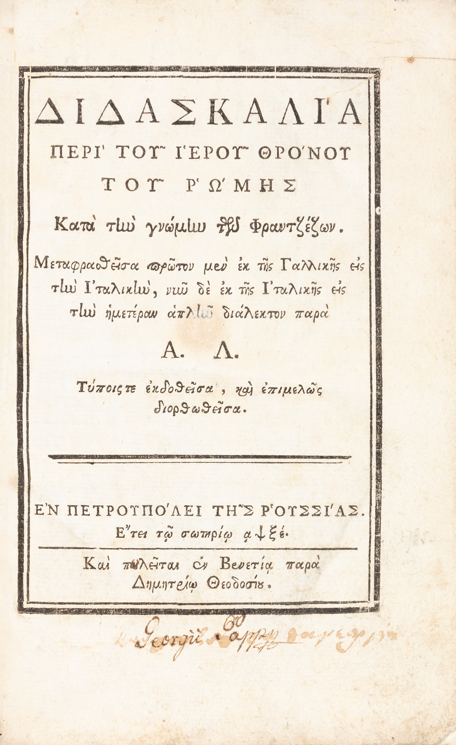Διδασκαλία περὶ τοῦ ἱεροῦ θρόνου τοῦ [sic] Ῥώμης κατὰ τὴν γνώμην τῶν Φραντζέζων, μεταφρασθεῖσα πρῶτον μὲν ἐκ τῆς γαλλικῆς εἰς τὴν ἰταλικήν, νῦν δὲ ἐκ τῆς ἰταλικῆς εἰς τὴν ἡμετέραν διάλεκτον παρὰ Α.[γαπίου] Λ.[οβέρδου], τύποις τε ἐκδοθεῖσα, καὶ ἐπιμελῶς διορθωθεῖσα.