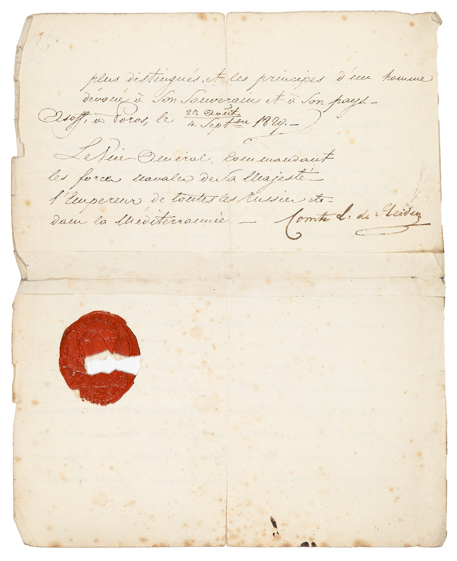 Τιμή εκτίμησης: € 300 - 400Γραμμένο στις σ. [1] και [2] ενός διφύλλου, 225 x 185 mm. (τσακίσεις, πρόχειρη επιδιόρθωση με ταινία χαρτιού, μικρή τρύπα, οι σ. [3] και [4] λευκές). Υπολείμματα σφραγίδας σε βουλοκέρι. • «…Depuis un an et demi que S. E. Monsr le Compte de Capodistrias l’a pris au service de la Grèce, en qualité de Chef d’Escadron et d’Organisateur de la Cavalerie regulière, M. Faron a rendu des services essentiels dans cette partie, et a rempli d’une manière exemplaire pendant tout ce temps, les difficiles et pénibles devoirs, qui lui avaient été confiés; - de sorte que je n’ hésite pas à manifester […] que le départ de cet Officier est une véritable perte pour la Grèce... ».