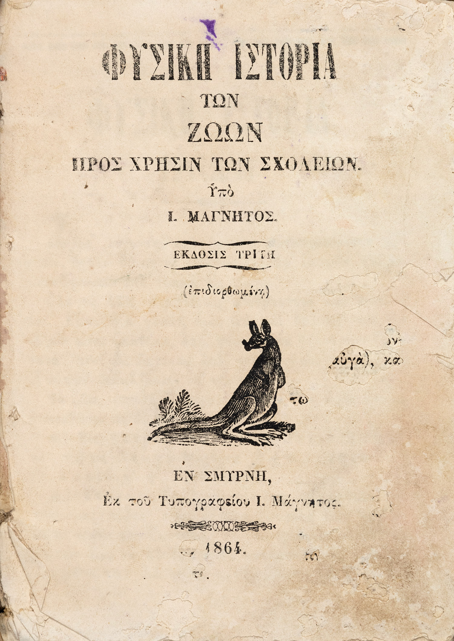 Φυσικὴ ἱστορία τῶν ζώων πρὸς χρῆσιν τῶν σχολείων. Ὑπὸ Ι. Μάγνητος. Ἔκδοσις τρίτη (ἐπιδιορθωμένη).