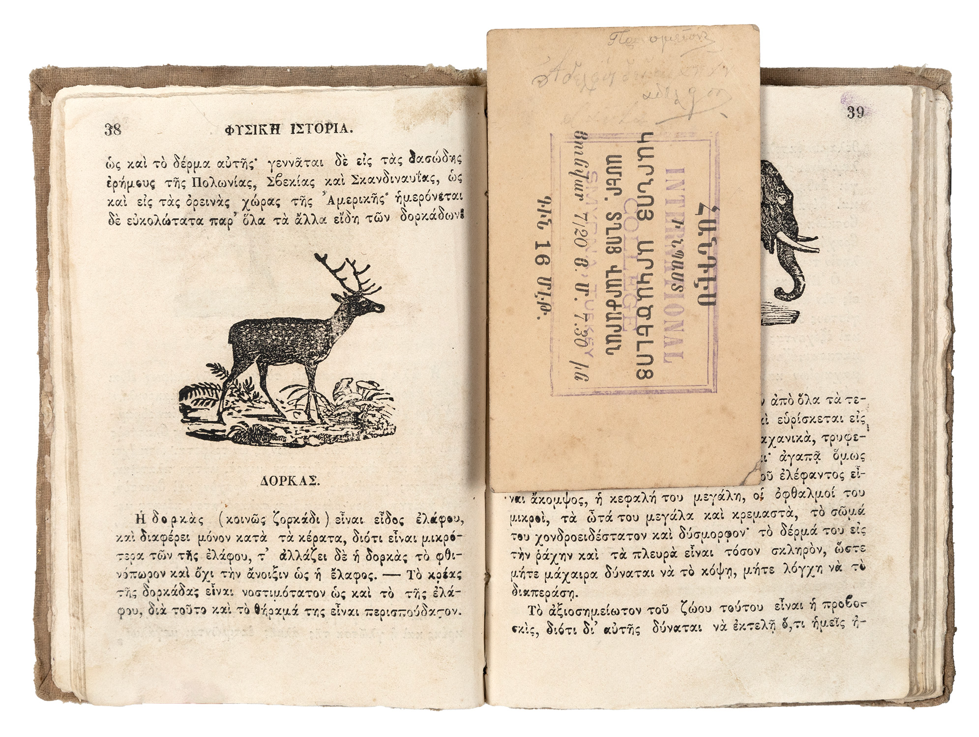 Τιμή εκτίμησης: € 200 - 30016o, 112 σ. (μικρές τρύπες στον τίτλο, μικρό σχίσιμο σε δύο φύλλα: σ. 29-30 και 53-54). Ξυλογραφίες εντός κειμένου. Πανί της εποχής της έκδοσης (φθορές, λερωμένο, λείπουν μικρά τμήματα της ράχης). ΑΒΙΒΛΙΟΓΡΑΦΗΤΟ. Πρβ. ΒΕΦΗ 1853.370 και 1857.426 (η πρώτη και η δεύτερη έκδοση).