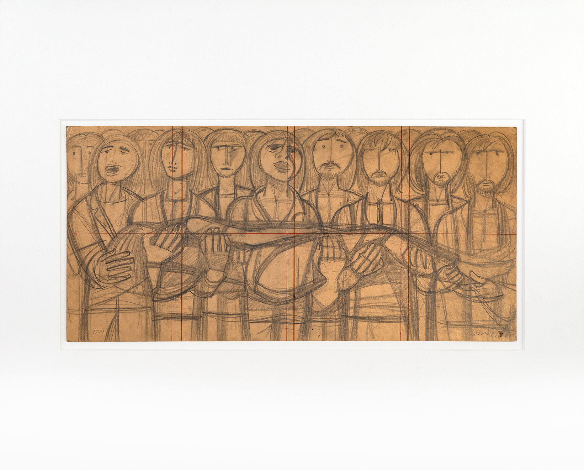Τιμή εκτίμησης: € 3.000 - 4.000Μολύβι και κόκκινο μελάνι σε χαρτόνι, 320 x 670 mm. Υπογεγραμμένο κάτω δεξιά: «Α. Τάσσος» και χρονολογημένο κάτω αριστερά: «1974». Σε κορνίζα. • Πρόκειται για το προσχέδιο του κεντρικού τμήματος της σύνθεσης της μνημειώδους ξυλογραφίας τοίχου του Α. Τάσσου, 17 Νοεμβρίου 1973 (1973-1975), διαστάσεων 89 x 534 x 2,5 cm. Η ξυλογραφία άρχισε να σχεδιάζεται τρεις μέρες μετά τα γεγονότα του Πολυτεχνείου και ολοκληρώθηκε τον Σεπτέμβριο του 1975. Από το 2004 αυτό το έργο-σύμβολο της κορύφωσης του αντιδικτατορικού αγώνα «που παραπέμπει σε ζωφόρο», ανήκει στη συλλογή έργων τέχνης της βουλής των Ελλήνων και εκτίθεται έξω από την αίθουσα της Γερουσίας. Βλ. 17 Νοεμβρίου 1973. Το έργο-σύμβολο του Α. Τάσσου για το Πολυτεχνείο, Αθήνα, Εταιρεία Εικαστικών Τεχνών Α. Τάσσος, Νοέμβριος 2023 (το Προσχέδιο εικονίζεται στις σ. 28-29). Μαζί αντίτυπο της έκδοσης. (2)