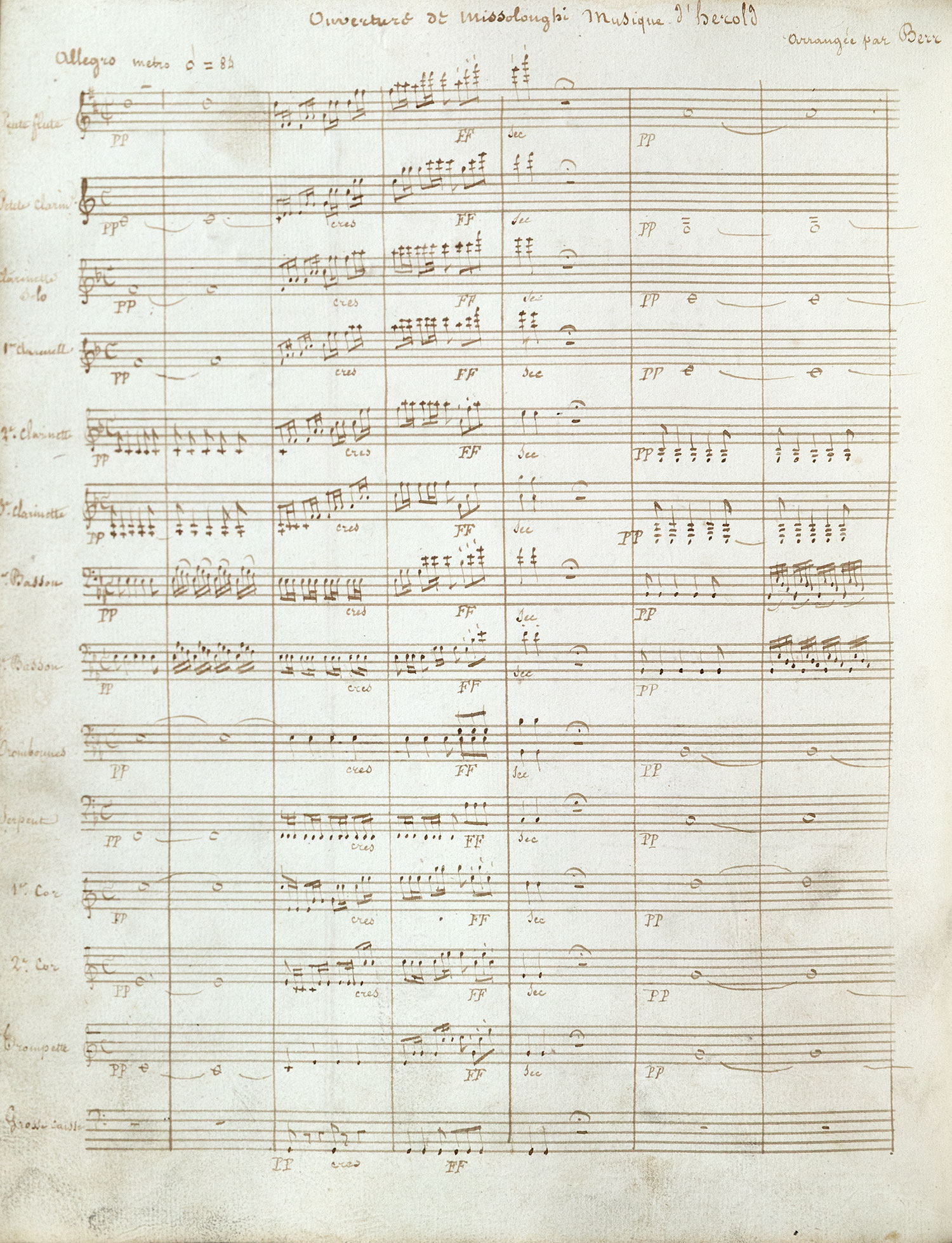 325 x 245 mm., 113 φ. (συνολικά ο τόμος). Στα φ. 36v-56r: Ouverture de Missolonghi. Musique d’Hérold, arrangée par Berr. [Charles-Auguste de Bériot, 1802-1870]. Χαρτὶ λευκό, παχύ, μελάνι καστανὸ ἀνοιχτὸ ἕως βαθύ. Ὑπάρχει μόνο μουσικὸ κείμενο μὲ 14 σειρὲς πενταγράμμων. Γραμμένη ἐπιφάνεια: 280 x 205 mm., τεύχη δυάδια (τετράφυλλα). Τὰ φύλλα 95r-109r καὶ 113v λευκά. Τόμος παχὺς καὶ βαρύς. Βιβλιοδεσία μὲ πολὺ χοντρὸ χαρτόνι καὶ μὲ δερμάτινο καφὲ κάλυμμα. Στὴ ράχη ἡ ἐπιγραφή: GARDE NATIONALE HARMONIE. • Ο Louis Joseph Ferdinand Hérold υπήρξε συνθέτης μουσικῶν συμφωνικῶν ἔργων. Tὸ μουσικὸ ἔργο ποὺ περιέχεται στὸν παρόντα τόμο παρουσιάστηκε γιὰ πρώτη φορὰ στὸ Παρίσι, στὸ θέατρο ODEON στὶς 10 Αὐγούστου 1828 καὶ στὴν Κέρκυρα ἀπὸ τὴ Φιλαρμονικὴ Ἑταιρεία «Μάντζαρος» στὶς 21 Δεκεμβρίου 2021. Τὸ ἔργο Ludovic λόγῳ τοῦ θανάτου τοῦ συνθέτη παρέμεινε ἀτελείωτο. • Συσταχωμένα: (φ.1r-36r) [Rossini], Ouverture de Semiramis.- Partition. (φ. 56v-61r) [Rossini], Ouverture de Semiramis. All(egr)o Vivace (σποραδικὲς ἐγγραφὲς) (φ. 61v-94v) Ouverture de Ludovic, musique d’Hérold arrangée par Berr. [C. de Bériot]. (φ. 109v-113v) Ἀνεπίγραφη μουσικὴ σύνθεση.