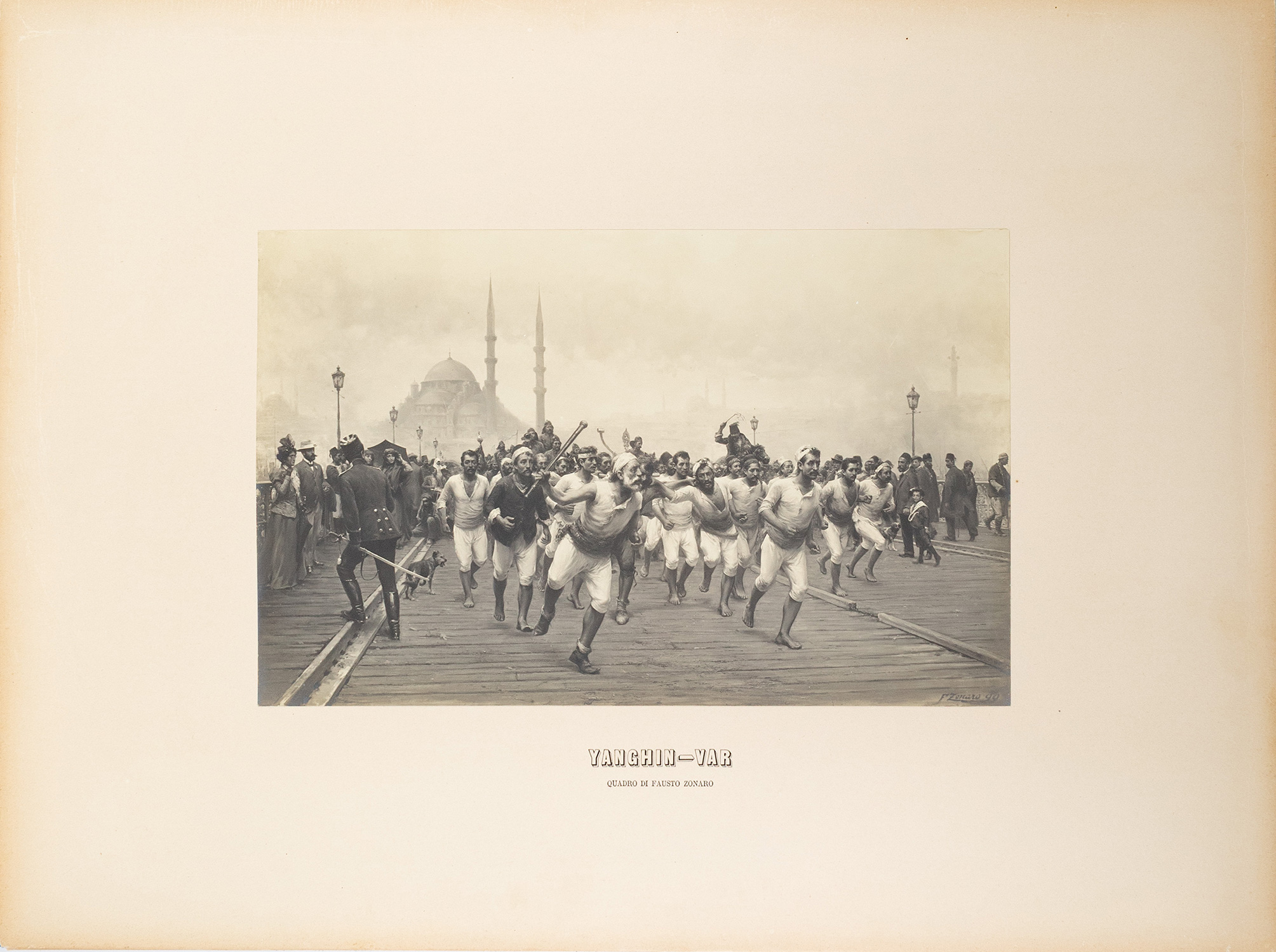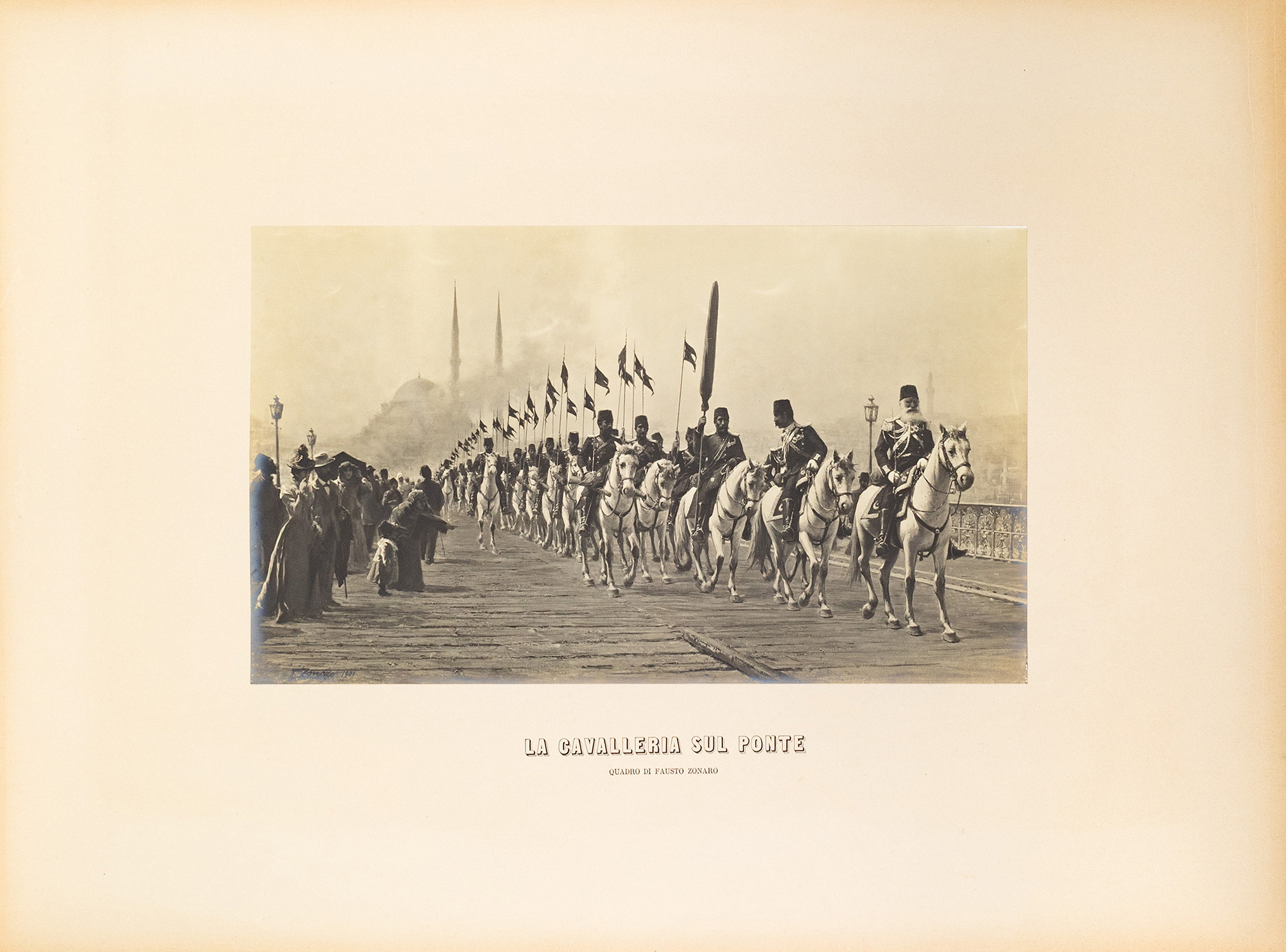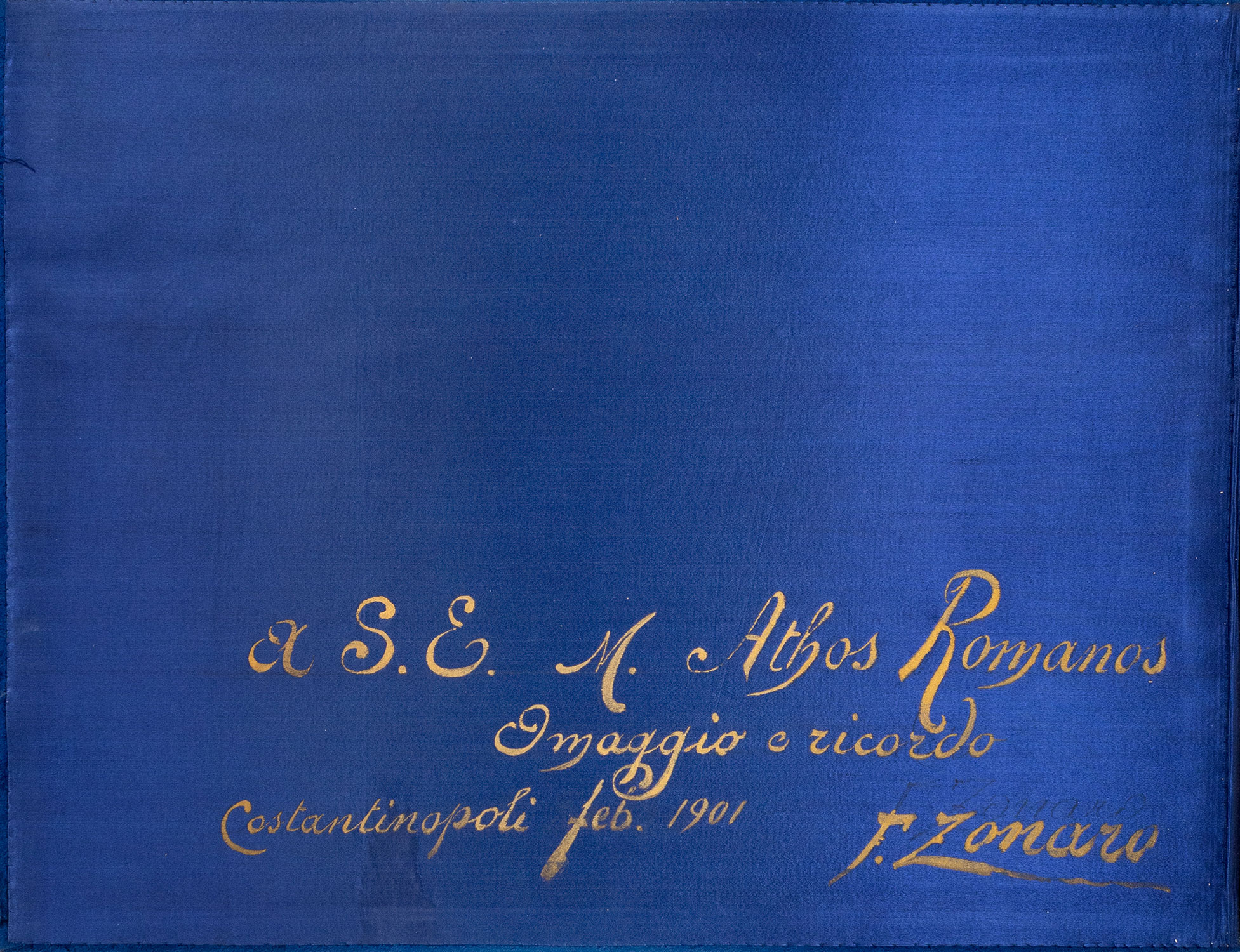 9 φωτοτυπικές αναπαραγωγές (collotypes) έργων του F. Zonaro (4 σπουδές και 5 έργα), διαστάσεων από 208 x 161 έως 250 x 382 mm., επικολλημένες σε 7 λυτά χαρτόνια διαστάσεων 480 x 640 mm. (λεκές από νερό στο πρώτο), όλες με έντυπες λεζάντες στα ιταλικά (τίτλος του έργου και η ένδειξη: «Quadro di Fausto Zonaro»). Τοποθετημένα σε περικάλυμμα επενδυμένο με μπλε βελούδο, 480 x 645 mm., με ιδιόχειρη αφιέρωση του καλλιτέχνη στον πολιτικό και διπλωμάτη Άθω Ρωμάνο (1858-1940) με χρυσό χρώμα στο εσωτερικό του πάνω καλύμματος («a S. E. M. Athos Romanos / Omaggio e ricordo / Costantinopoli feb 1901»). • Ο Ιταλός οριενταλιστής ζωγράφος Fausto Zonaro (1854-1929) έζησε στην Κωνσταντινούπολη για περίπου μία εικοσαετία (1891-1909) και από το 1896 διορίστηκε ζωγράφος της Οθωμανικής Αυλής από τον σουλτάνο Abdülhamid II. Σημαντικό τμήμα του έργου του, εκτός από τους ιστορικούς πίνακες και τα πορτραίτα, τα εμπνευσμένα από την ιστορία της Οθωμανικής Αυτοκρατορίας, κατέχουν οι σκηνές από την καθημερινή ζωή των κατοίκων, τις αγορές, τον Βόσπορο και γενικότερα την τοπιογραφία της Κωνσταντινούπολης.