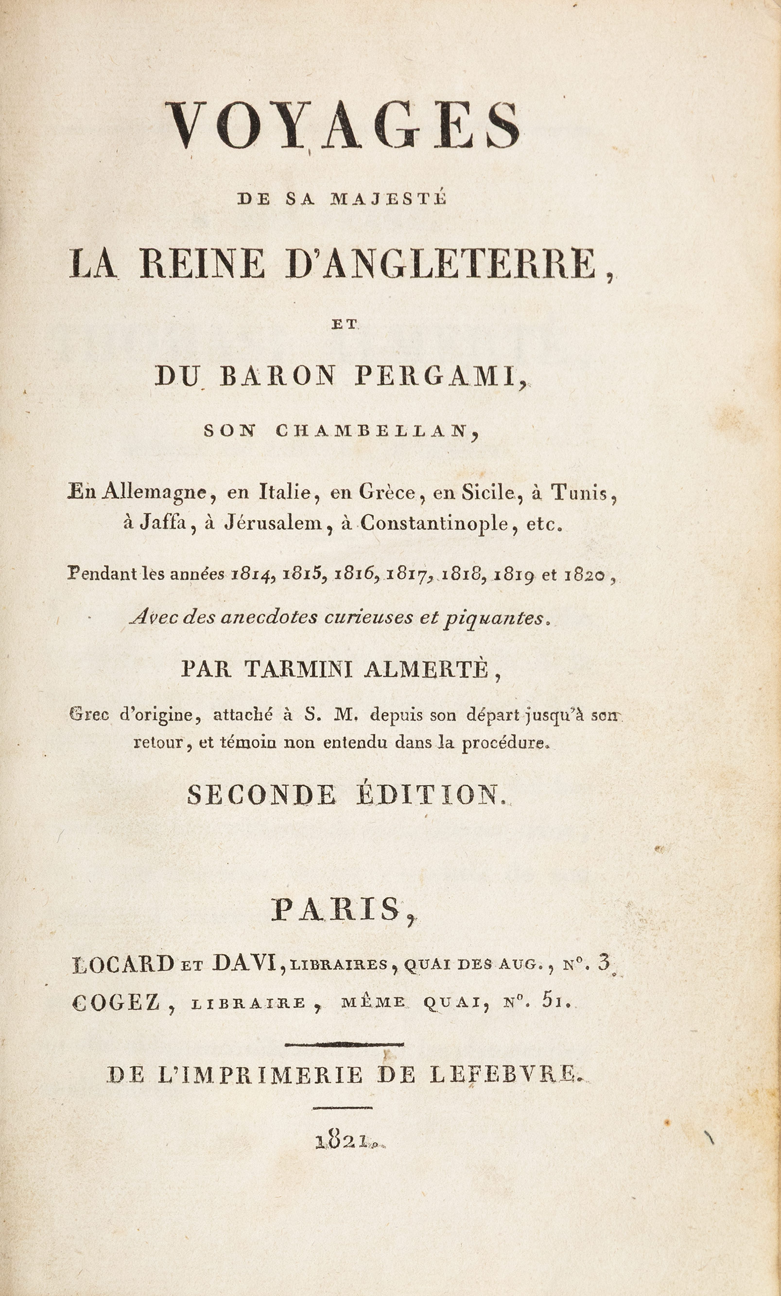 Voyages de sa majesté la Reine d'Angleterre et du Baron Pergami, son Chambellan, en Allemagne, en Italie, en Grèce, en Sicile, à Tunis, à Jaffa, à Jerusalem, à Constantinople, etc. pendant les années 1814, 1815, 1816, 1817, 1818, 1819 et 1820, avec des anecdotes curieuses et piquantes. Seconde édition.