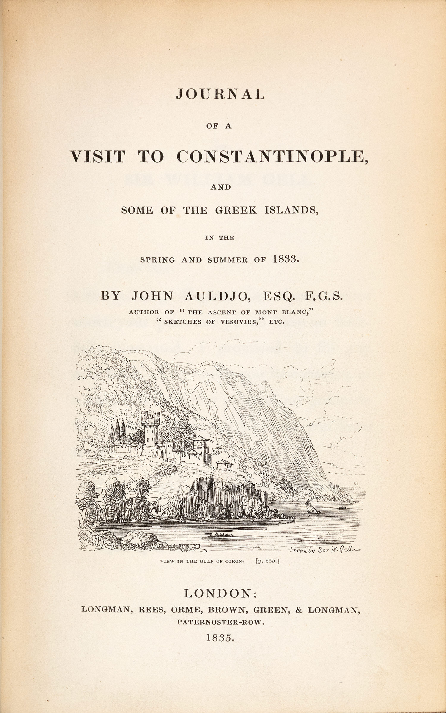 ΠΡΩΤΗ ΕΚΔΟΣΗ. 8ο (213 x 135 mm.), xii + 259 σ. Με 2 ξυλόγραφες βινιέτες σε σχέδια του W. Gell (στον τίτλο και στη σ. 203) και 7 οξυγραφίες εκτός κειμένου σε σχέδια του συγγραφέα, αντίτυπο με ιδιόχειρη αφιέρωση. Δέρμα της εποχής της έκδοσης στη ράχη και τις γωνίες (φθορές, ξεθωριασμένη η ράχη, μαρμαρογραφημένα και με εμπίεστη διακόσμηση τα καλύμματα, ex-libris J. J. Chapman και Α. Δ. Χατζηδήμου). Blackmer 56, Atabey 42, Weber, I, 225, Contominas 21.