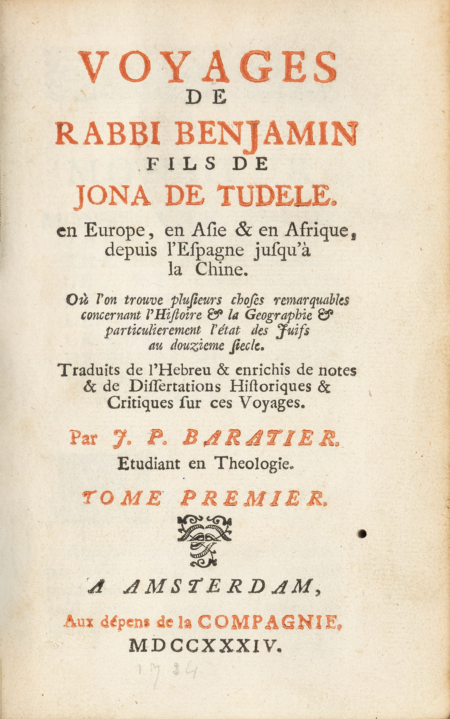Voyages de Rabbi Benjamin, fils de Jona de Tudèle, en Europe, en Asie & en Afrique, depuis l'Espagne jusqu'à la Chine. Où l'on trouve plusieurs choses remarquables concernant l'histoire & la geographie & particulierement l'état des Juifs au douzième siècle.