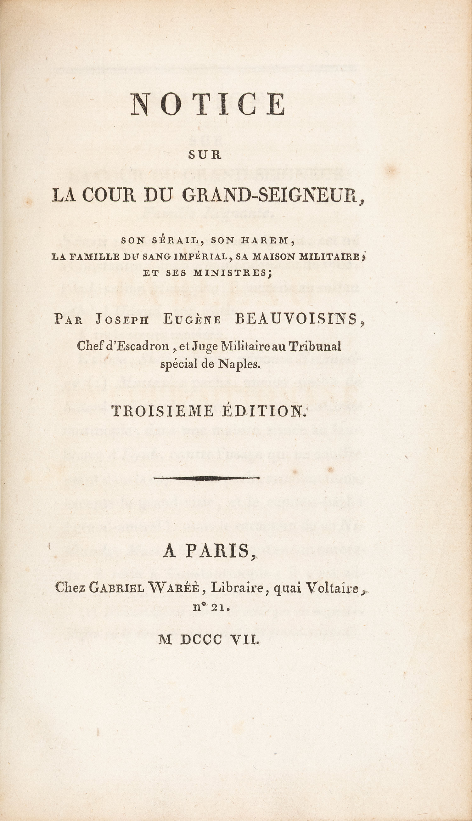 Notice sur la Cour du Grand-Seigneur, son Sérail, son Harem, la famille du sang Impérial, sa Maison militaire et ses Ministres.