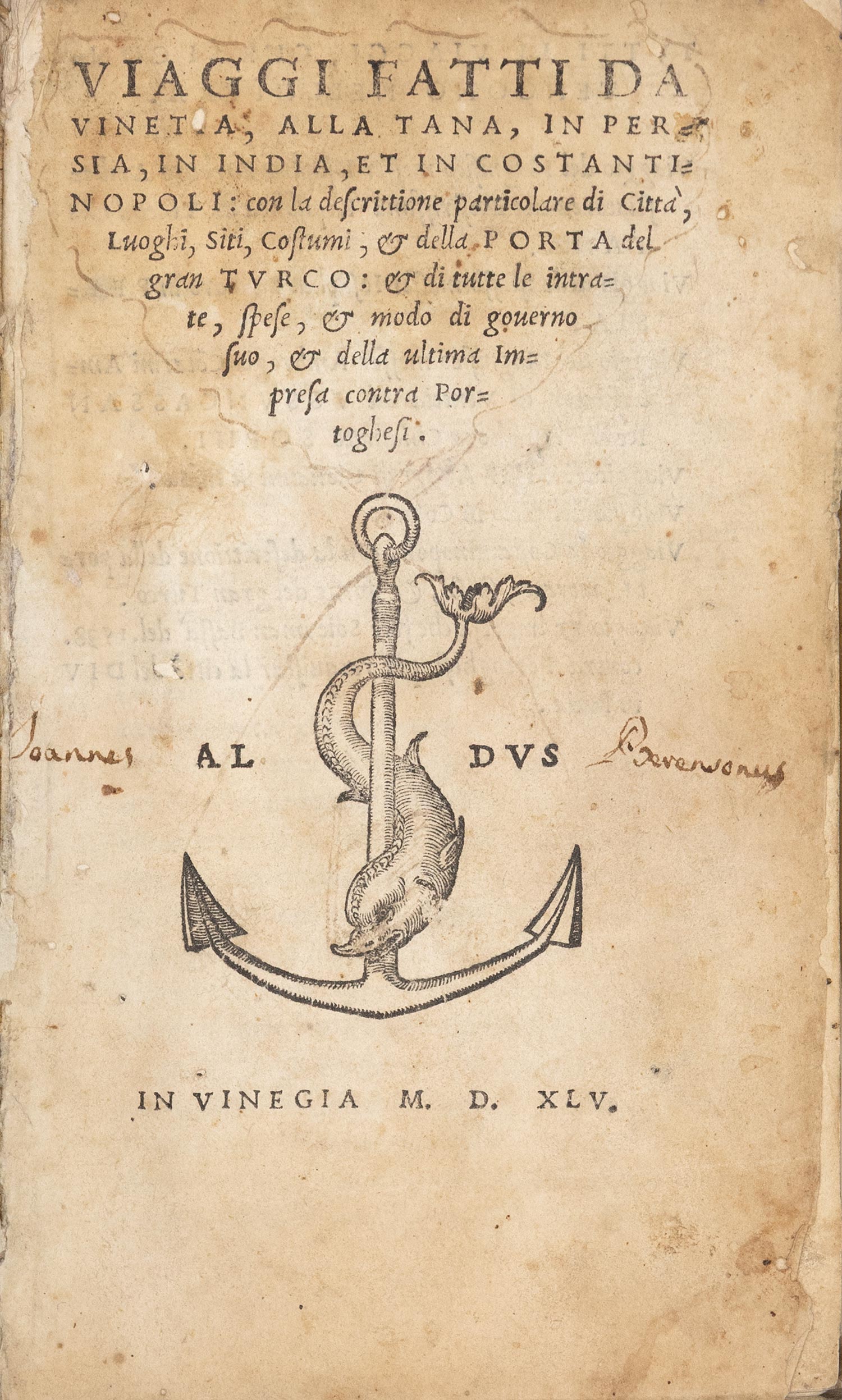 Viaggi fatti da Vinetia, alla Tana, in Persia, in India, et in Constantinopoli: con la descrittione particolare di città, luoghi, siti, costumi, & della Porta del gran Turco: & di tutte le intrate, spese, & modo di governo suo, & della ultima impresa contra Portoghesi.